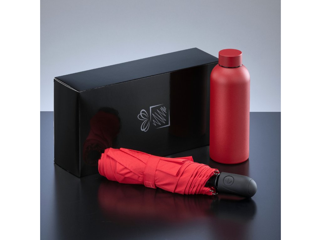 Praktická sada pro lidi na cestách, která zahrnuje Nordic termohrnek a skládací deštník z kolekce Cambridge.\nNordic termoska je vyrobena z vysoce kvalitní nerezové oceli 18/8 od korejské společnosti POSCO. Odolná vůči kyselinám a uhličitanům, poskytuje trvanlivost a elegantní vzhled. Pevná prášková povrchová úprava zajišťuje odolnost proti mechanickému poškození a bezpečný úchop. Skládací deštník s funkcí DAS (automatický systém otevírání a zavírání) je díky systému proti větru mechanicky odolný.\nSada je k dispozici v různých barvách. Balená v elegantní černé dárkové krabičce.Doplňkové parametry