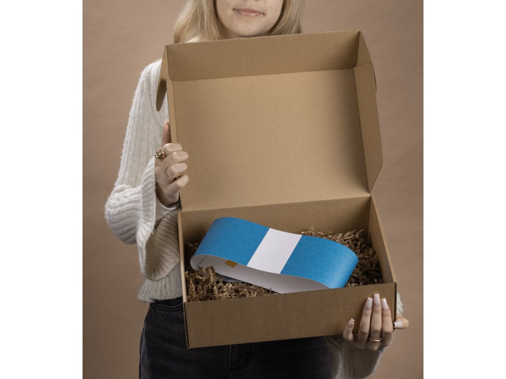 Dárkový balicí set AZUL „M“ je hotovým a stylovým řešením pro firemní dárky. Obsahuje pevnou krabičku z kraftové lepenky, béžovou papírovou výplň (s atestem pro styk s potravinami) a modrý obal se stříbrným autorským motivem vytvořeným speciálně pro BLUE COLLECTION. Obal zajišťuje elegantní zakončení a díky samolepicímu proužku se snadno používá. Sada je k dispozici ve třech velikostech (S, M, L) – snadno ji přizpůsobíte plánovanému obsahu.Doplňkové parametry