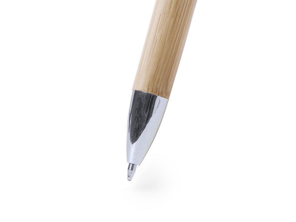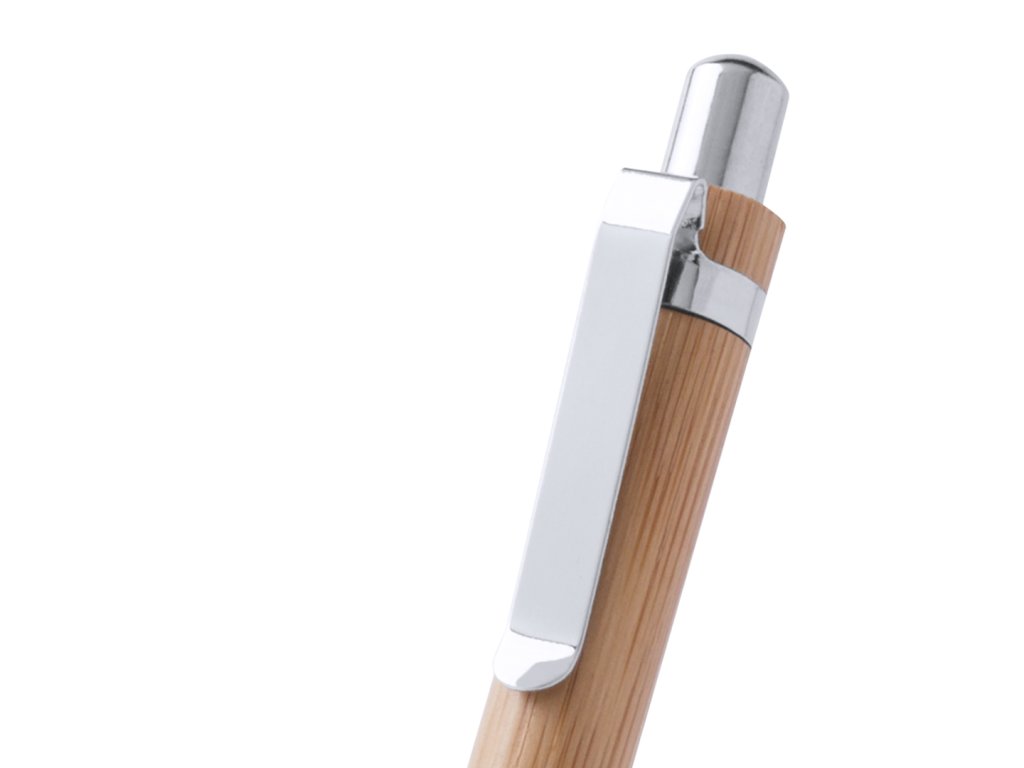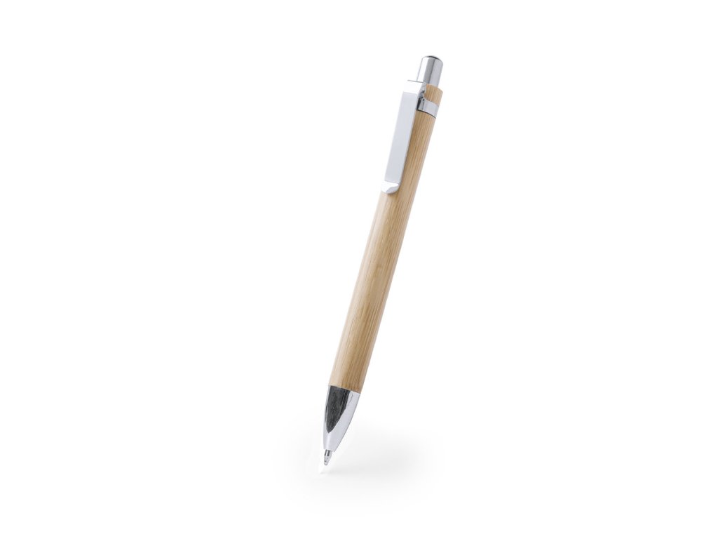 Elegantní kuličkové pero s push-up mechanismem v těle z přírodního bambusového dřeva a lesklým stříbrným metalickým povrchem doplňků. Jumbo zásobník a modrý inkoust.