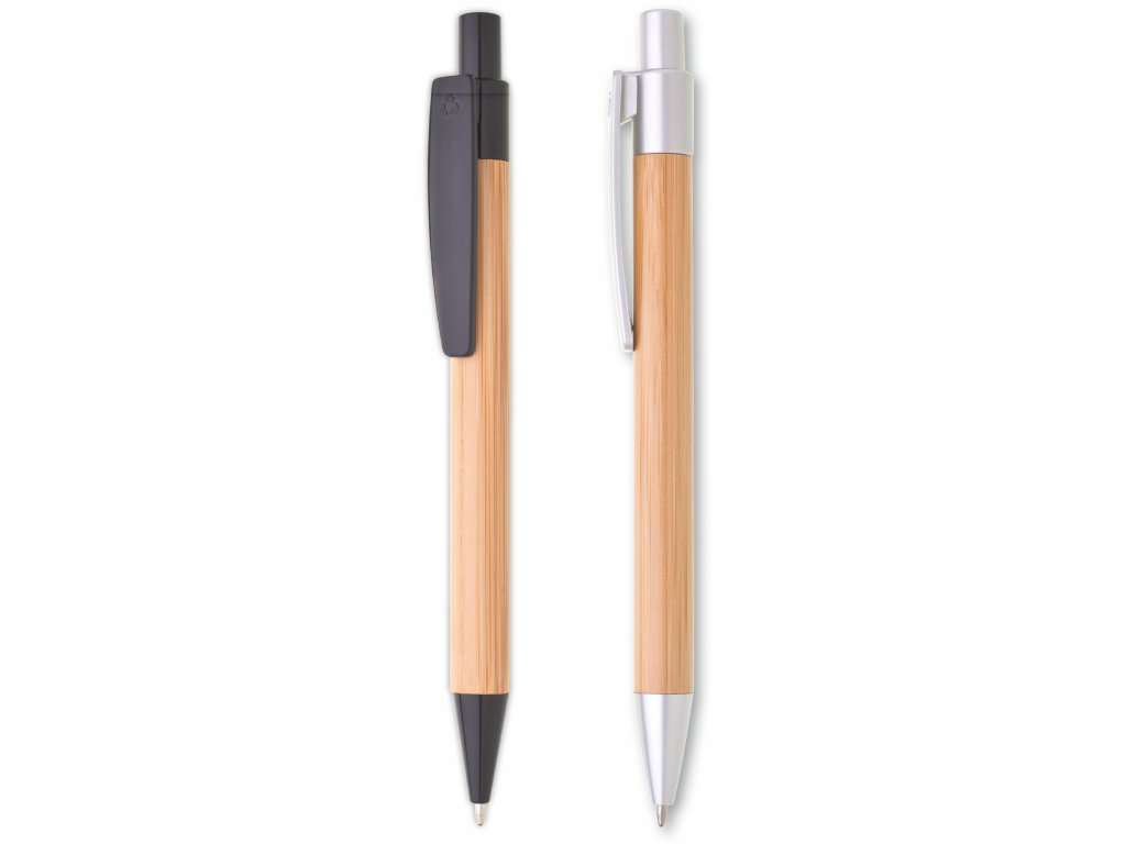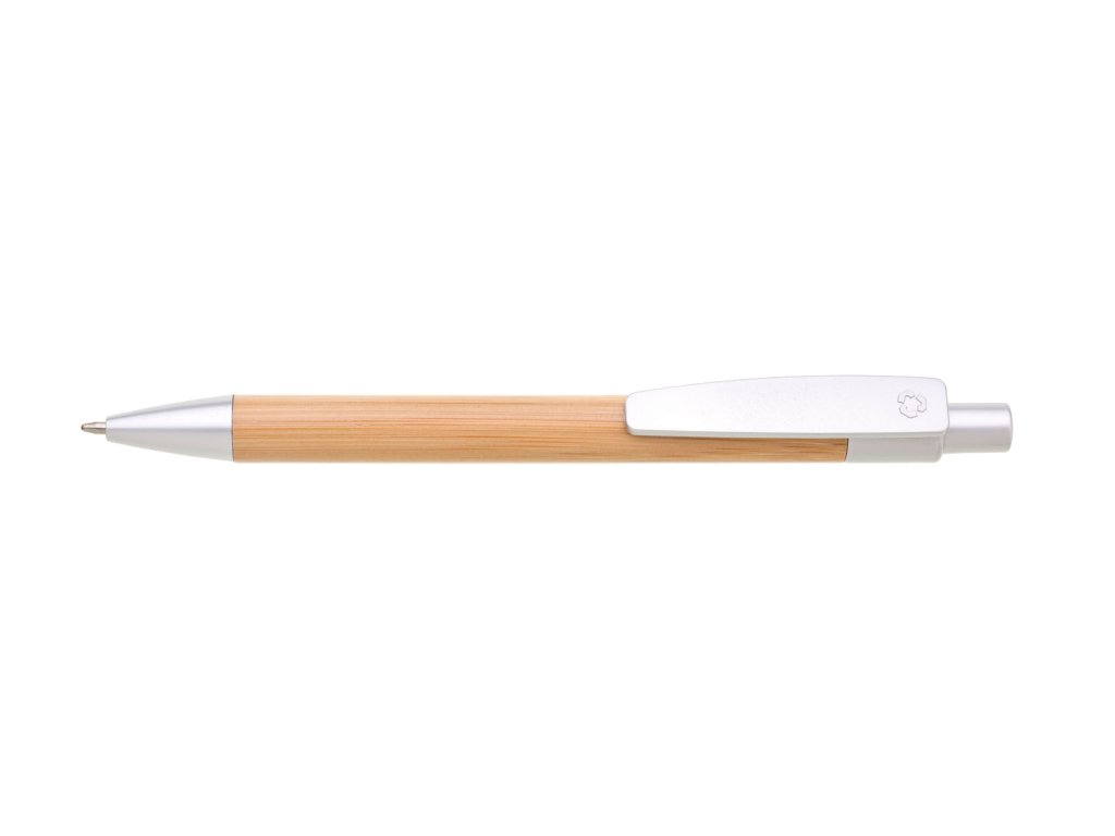 Dřevěné kuličkové pero BORGO - tělo je vyrobeno z bambusu, špička, klip a cvakátko je ze stříbrného plastu. Náplň - velkoobsahová, modře píšící.Doplňkové parametry