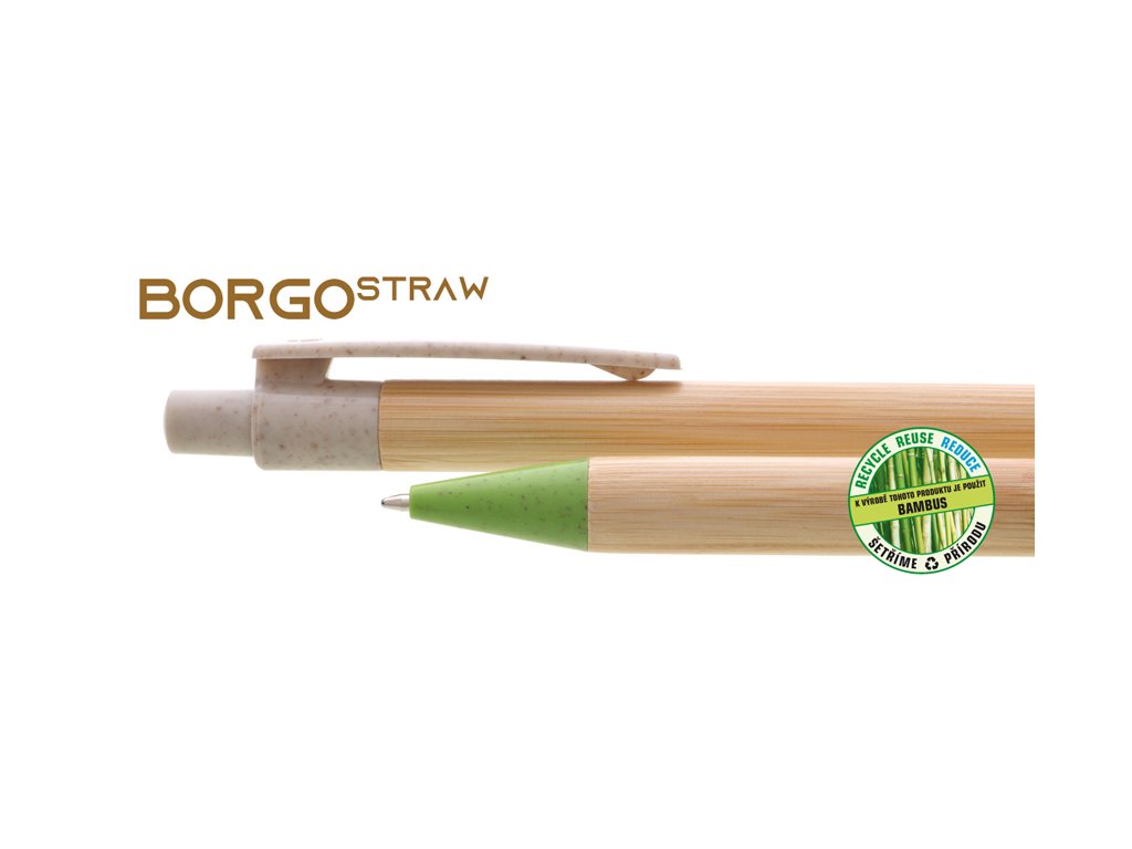 Bambusové tělo propisky s doplňky z plastu s podílem slámy. Náplň modře píšící velkoobsahová.Doplňkové parametry