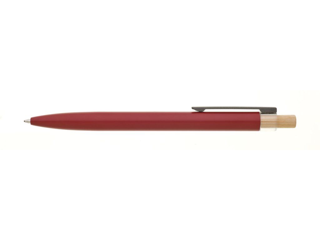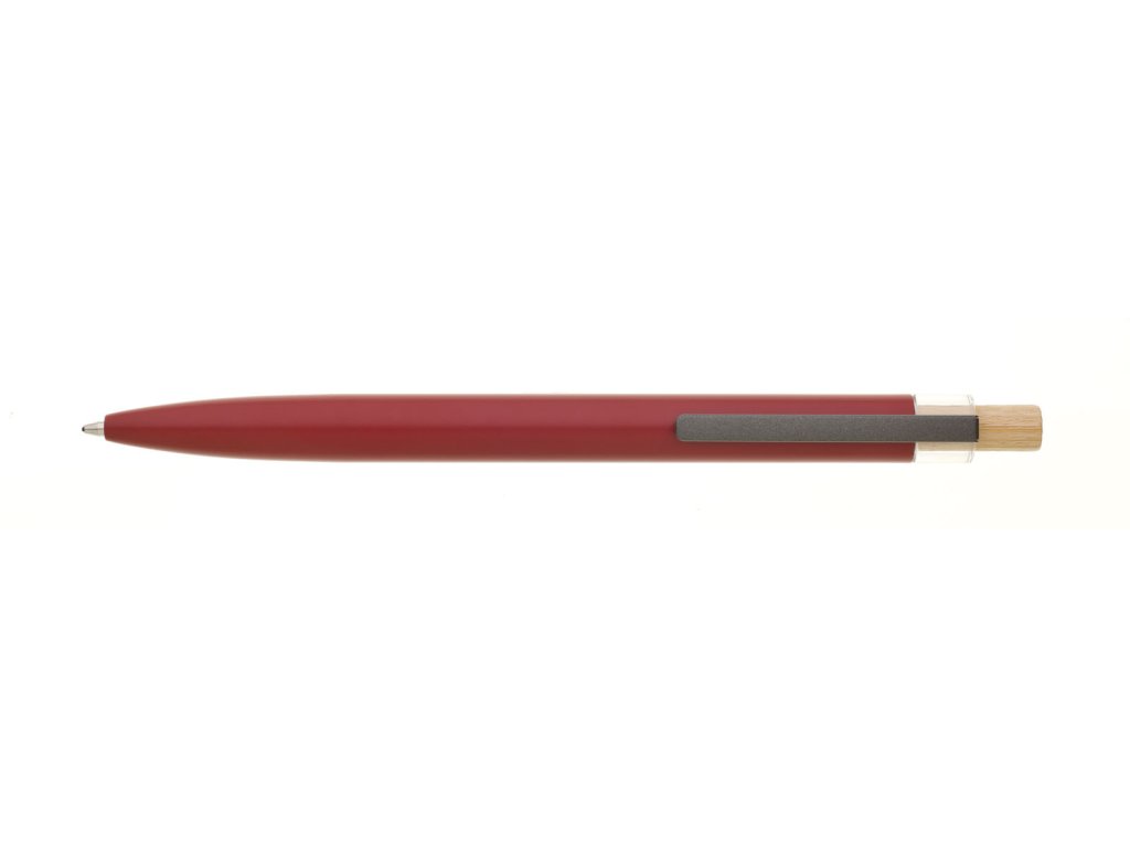 Červená designová kovová propiska z recyklovaného hliníku. Tmavý kovový klip je uchycen v ozdobné transparentní koncovce, doplněné bambusovým cvakátkem. Náplň velkoobsahová, modře píšící. Kolekce SAVE THE NATURE.Doplňkové parametry