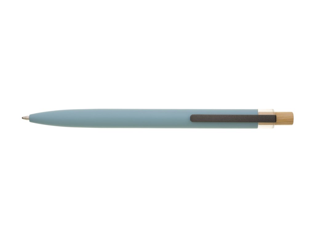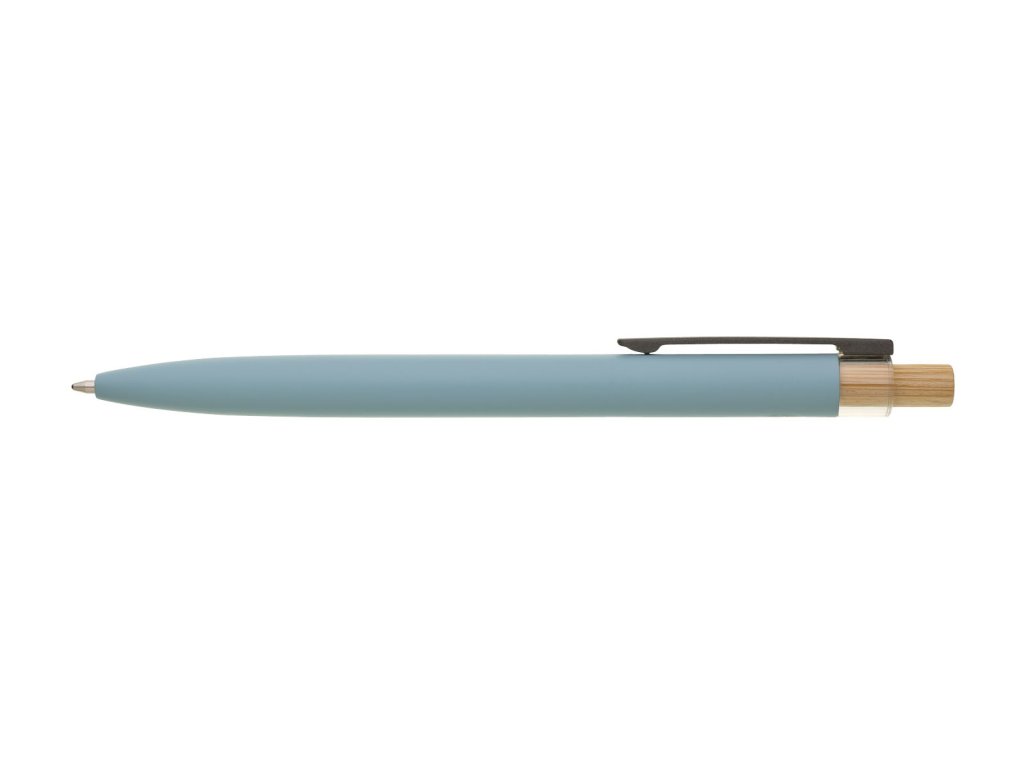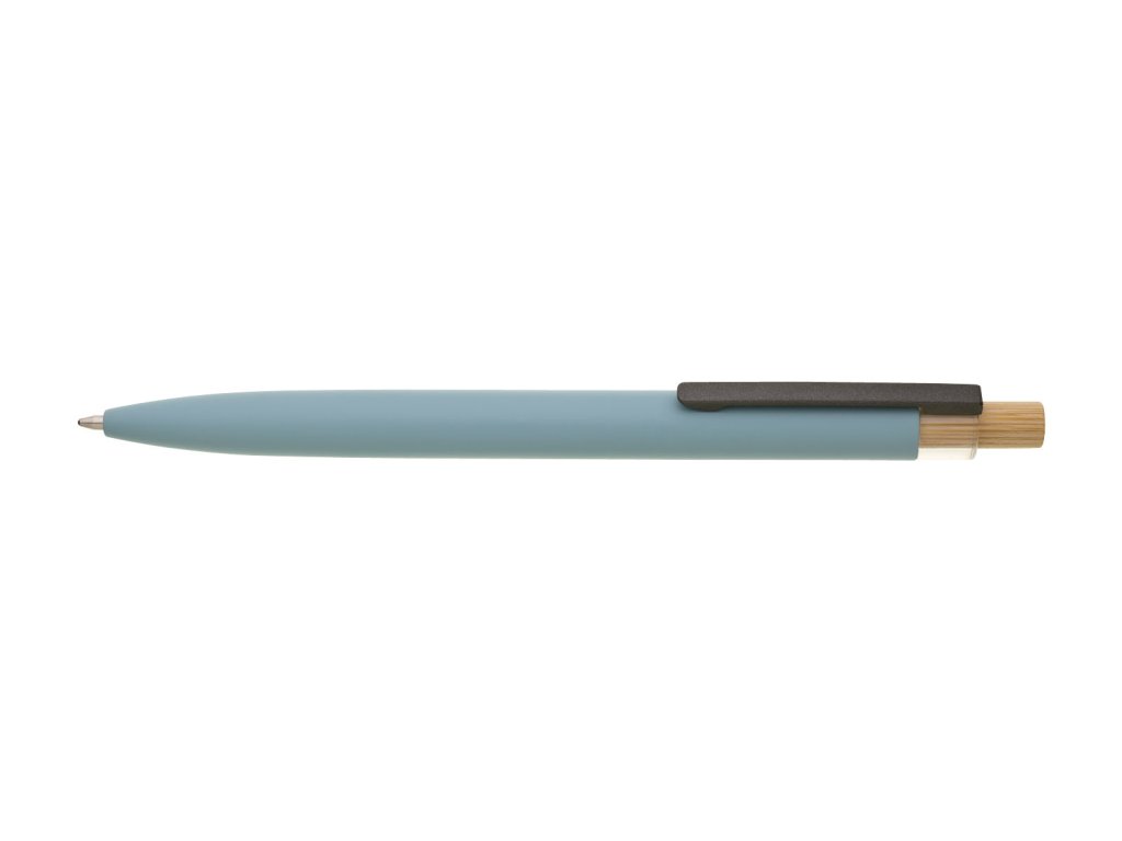 Světle modrá designová kovová propiska z recyklovaného hliníku. Tmavý kovový klip je uchycen v ozdobné transparentní koncovce, doplněné bambusovým cvakátkem. Náplň velkoobsahová, modře píšící. Kolekce SAVE THE NATURE.Doplňkové parametry