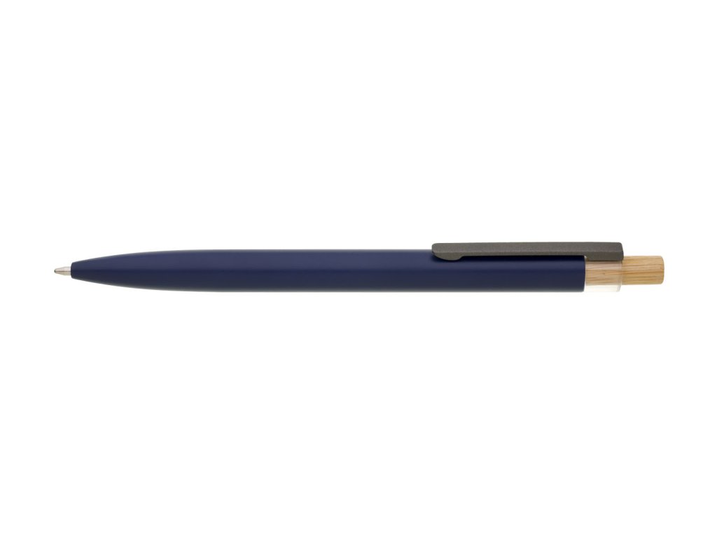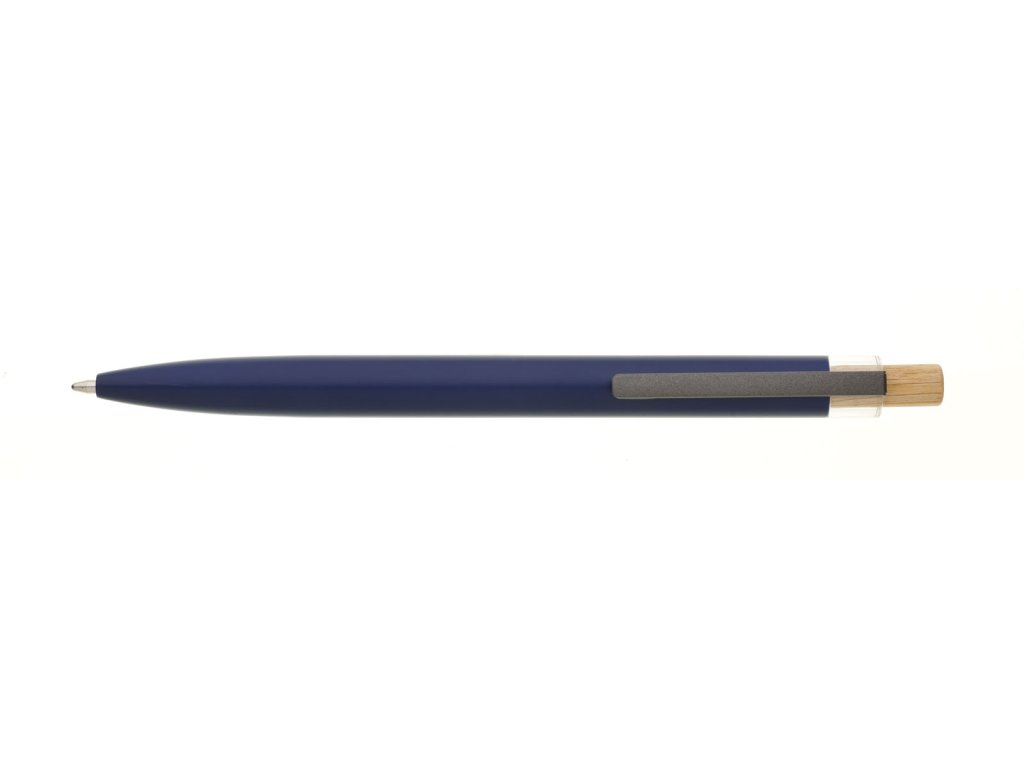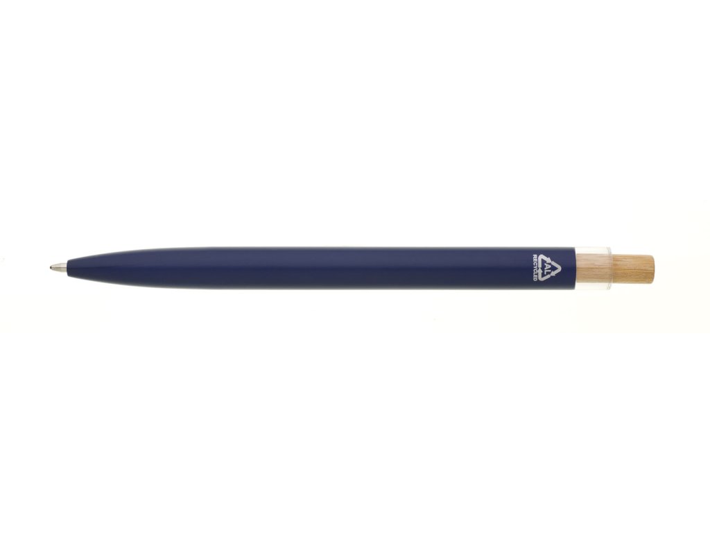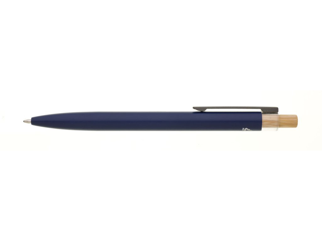 Modrá designová kovová propiska z recyklovaného hliníku. Tmavý kovový klip je uchycen v ozdobné transparentní koncovce, doplněné bambusovým cvakátkem. Náplň velkoobsahová, modře píšící. Kolekce SAVE THE NATURE.Doplňkové parametry