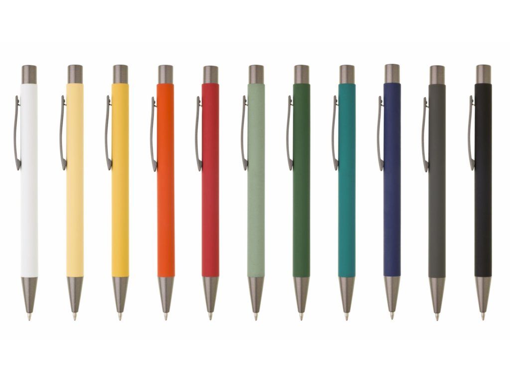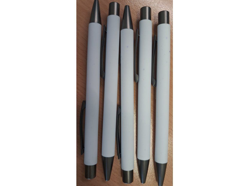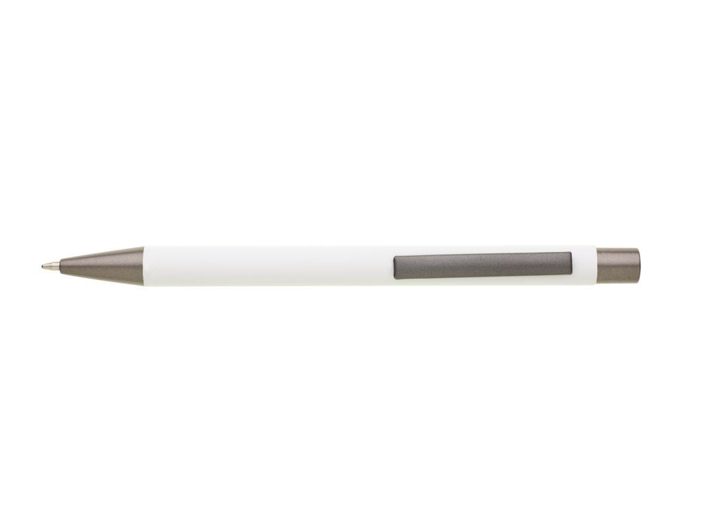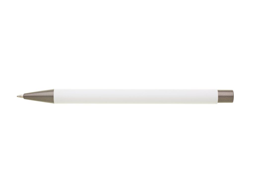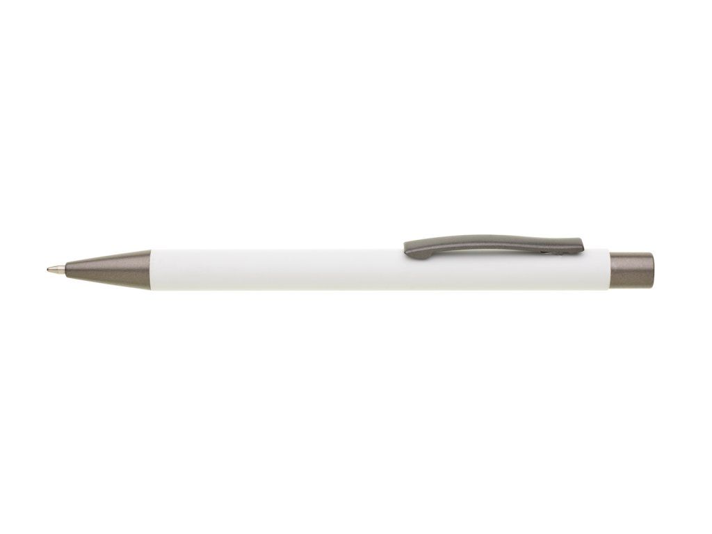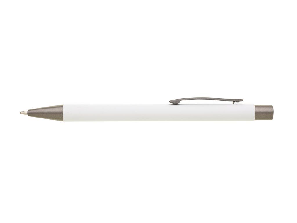 Kovová propiska CAGERI SOFT s hnědo-černými doplňky, s bílým pogumovaným povrchem. Velkoobsahová modrá náplň. Na bílém povrchu propisky jsou místy drobné tečky.Doplňkové parametry