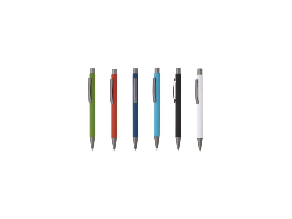 Kovová propiska CAGERI SOFT s hnědo-černými doplňky, s oranžovým pogumovaným povrchem. Velkoobsahová modrá náplň.Doplňkové parametry