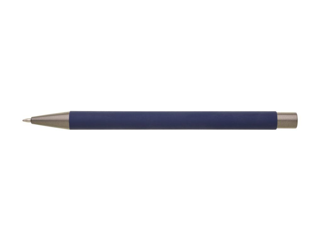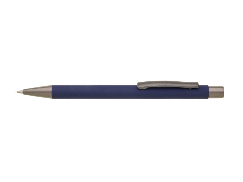 Kovová propiska CAGERI SOFT s hnědo-černými doplňky, s tmavě modrým pogumovaným povrchem. Velkoobsahová modrá náplň.Doplňkové parametry