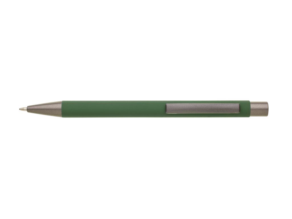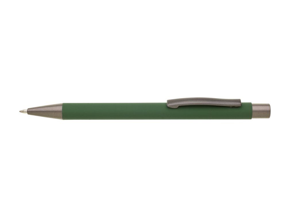 Kovová propiska CAGERI SOFT s hnědo-černými doplňky, se zeleným pogumovaným povrchem. Velkoobsahová modrá náplň.Doplňkové parametry