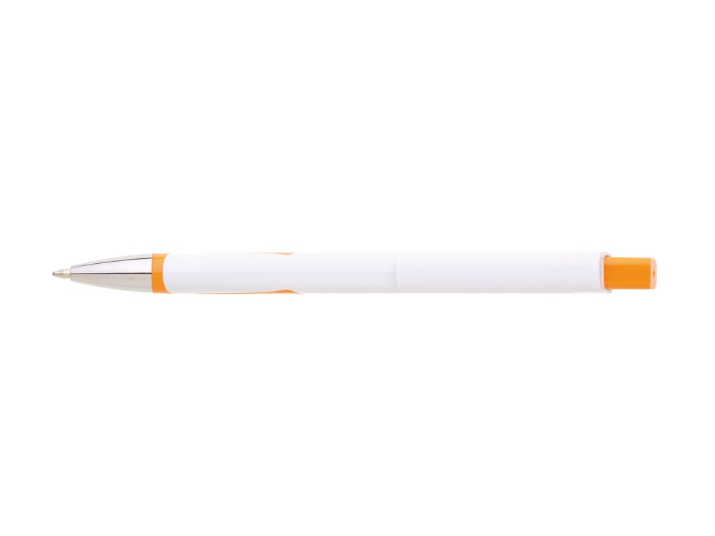 Plastová bílá propiska CARRE se čtvercovým profilem a oranžovými doplňky. Ideální na uv potisk. Náplň velkoobsahová, modře píšící.Doplňkové parametry