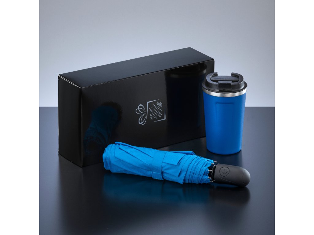 Praktická sada pro osoby na cestách. Plně automatický skládací deštník a hrnek na kávu z korejské oceli POSCO 18/8 s vynikajícími izolačními vlastnostmi. Dostupné v mnoha barvách. Baleno v elegantní černé krabičce.Doplňkové parametry