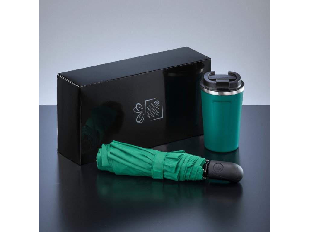 Praktická sada pro osoby na cestách. Plně automatický skládací deštník a hrnek na kávu z korejské oceli POSCO 18/8 s vynikajícími izolačními vlastnostmi. Dostupné v mnoha barvách. Baleno v elegantní černé krabičce.Doplňkové parametry