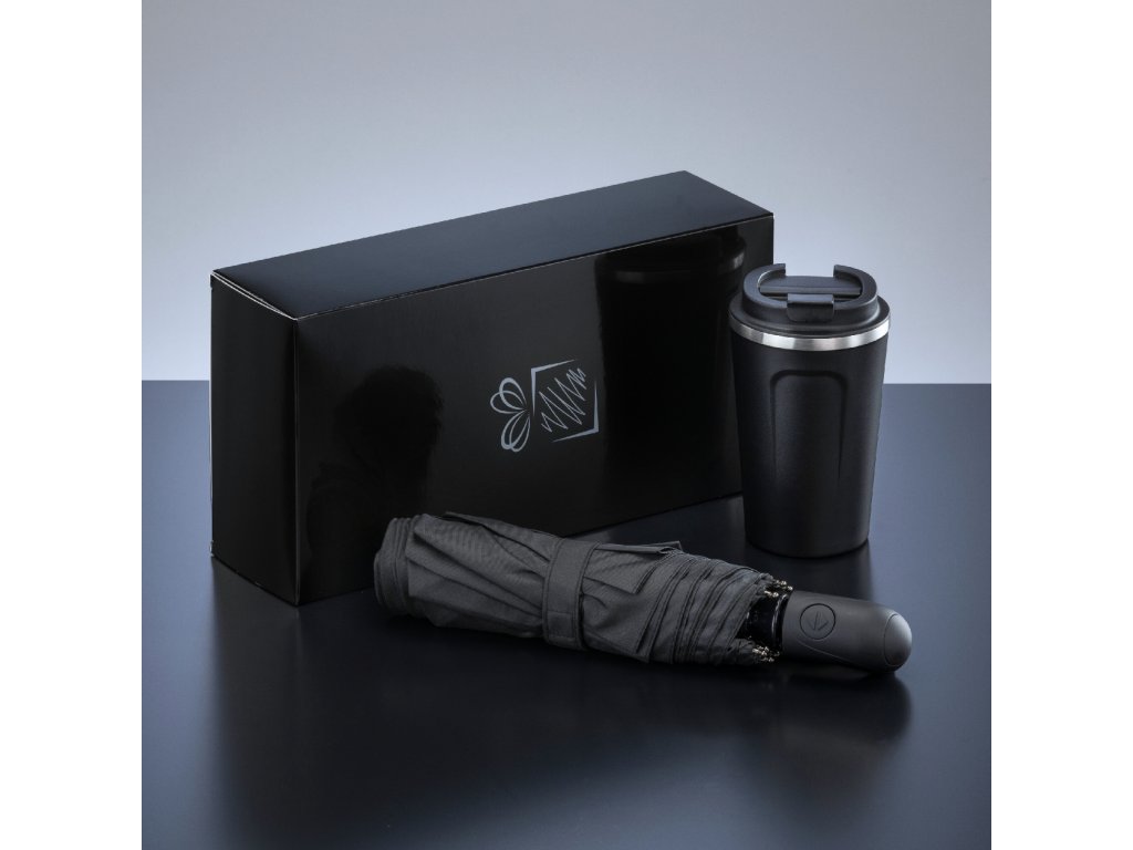 Praktická sada pro osoby na cestách. Plně automatický skládací deštník a hrnek na kávu z korejské oceli POSCO 18/8 s vynikajícími izolačními vlastnostmi. Dostupné v mnoha barvách. Baleno v elegantní černé krabičce.Doplňkové parametry