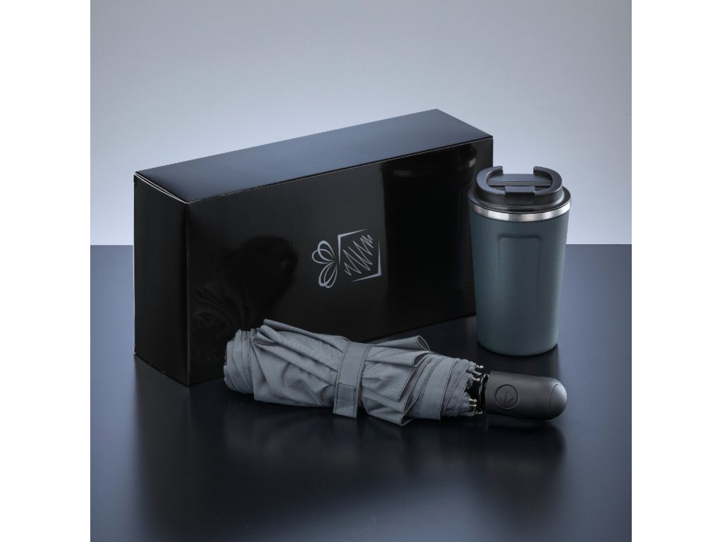 Praktická sada pro osoby na cestách. Plně automatický skládací deštník a hrnek na kávu z korejské oceli POSCO 18/8 s vynikajícími izolačními vlastnostmi. Dostupné v mnoha barvách. Baleno v elegantní černé krabičce.Doplňkové parametry