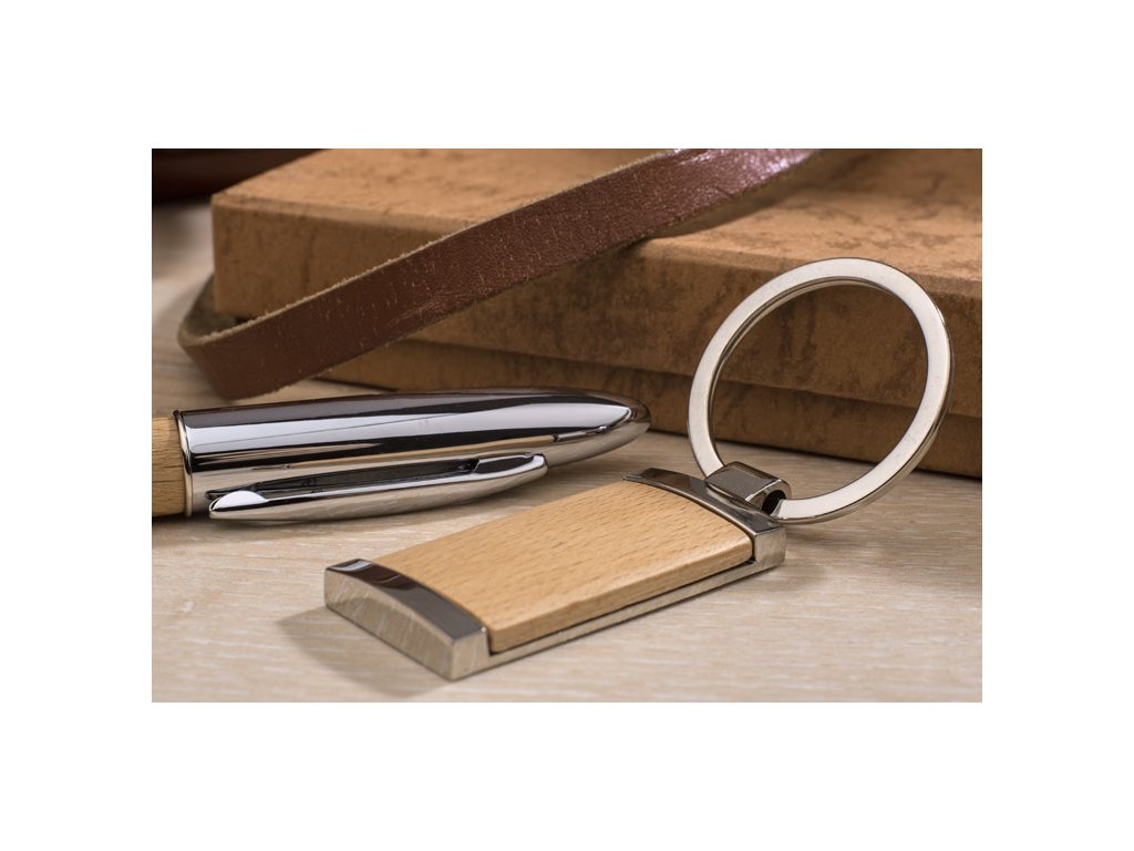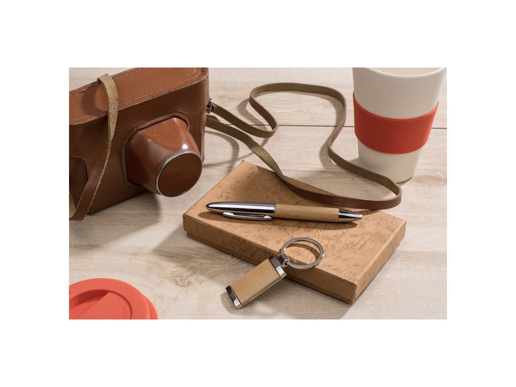 Ekologická dárková sada obsahující pero a klíčenku vyrobenou z kovu a dřeva. Černá náplň do pera. Můžeme vyryt gravírování na pero nebo tisk vašeho loga na krabici.Doplňkové parametry