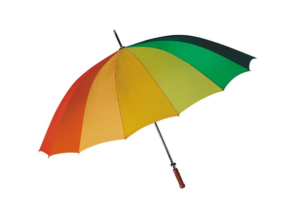 Rozměry: Ø 130 cm, 16 panelů, délka 102 cm. Rovná dřevěná anatomická rukojeť, chromovaná kovová hůl, manuální otvírání