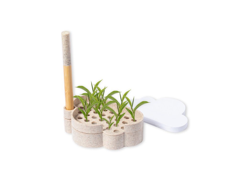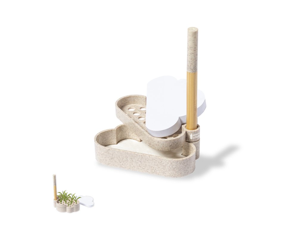 Přírodní linie, držák na zápisník se semínky s originálním designem mraků. Obsahuje: Základna s držákem na pero a dvěma přihrádkami, včetně listu semínkového papíru. Vyrobeno z pšeničné slámy, aby se podpořilo využívání přírodních surovin a snížily se emise znečišťujících látek. kuličkové pero s tělem z bambusového uzávěru a detaily z pšeničné slámy. V modrém inkoustu. sada prezentována v samostatné kraftové krabičce s návodem k použití v angličtině a španělštině.Buďte první, kdo napíše příspěvek k této položce.