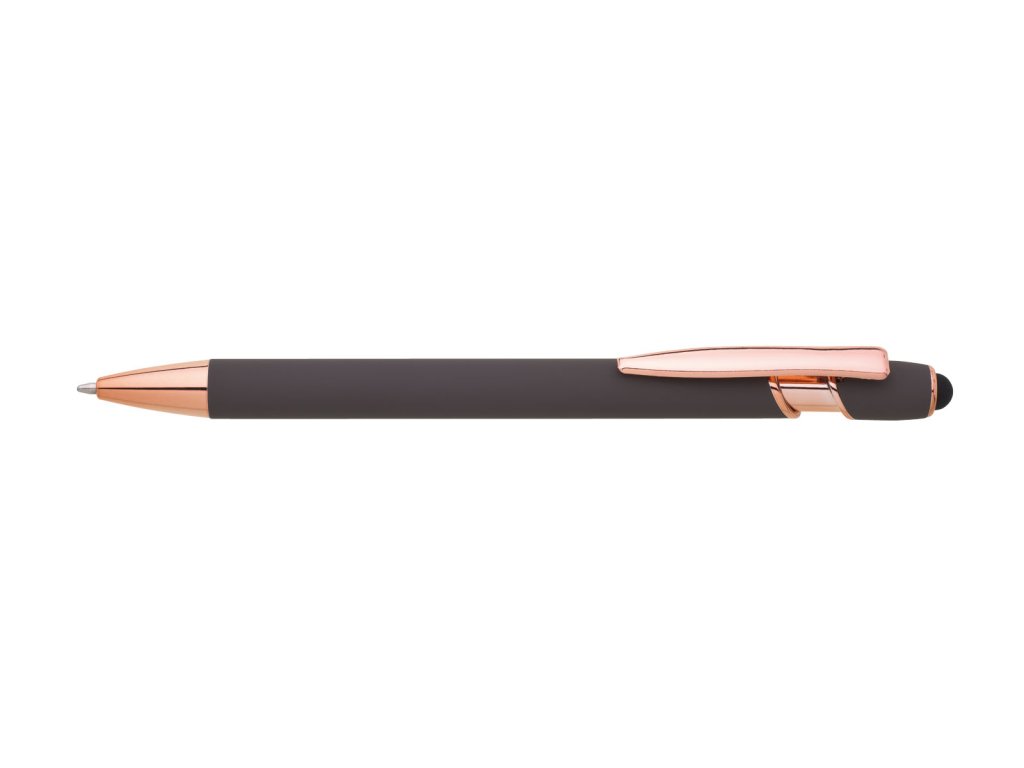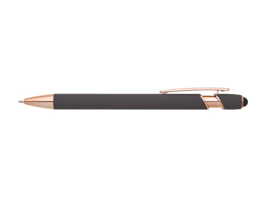 Kovová propiska se soft povrchem, touch koncovkou a doplňky v růžovo-zlaté barvě. Laserované logo je lesklé, růžovo-zlaté. Náplň modře píšící. Výsledný efekt laserového značení je lesklý, v barvě doplňků.Doplňkové parametry