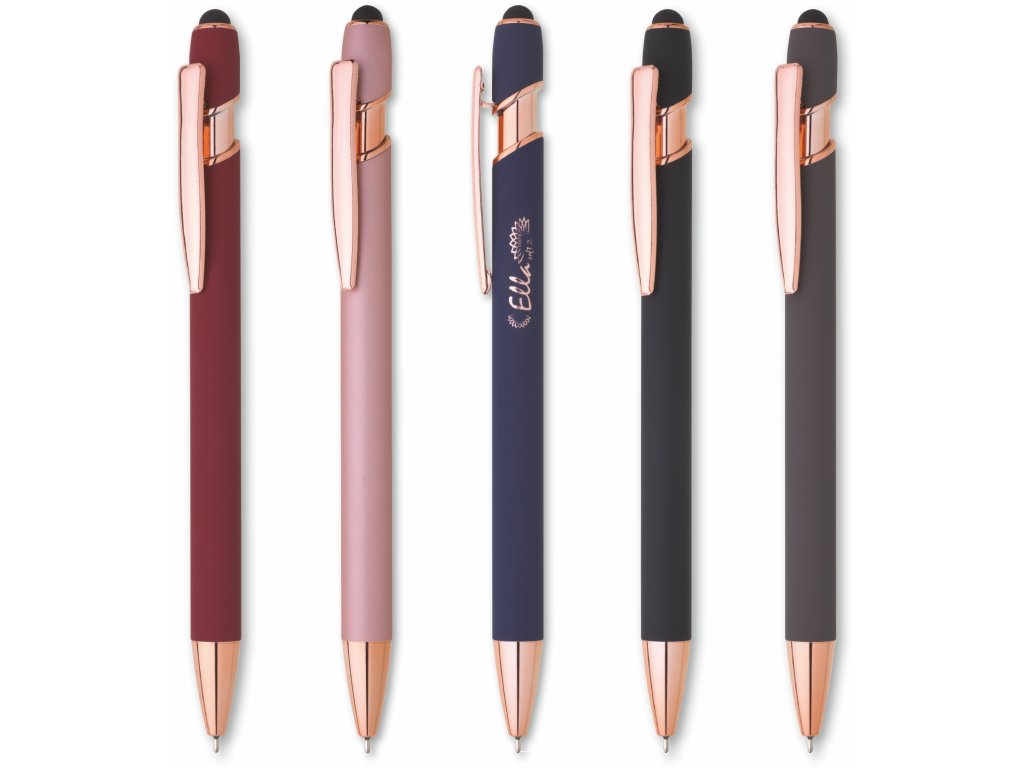 Kovová propiska se soft povrchem, touch koncovkou a doplňky v růžovo-zlaté barvě. Laserované logo je lesklé, růžovo-zlaté. Náplň modře píšící. Výsledný efekt laserového značení je lesklý, v barvě doplňků.Doplňkové parametry