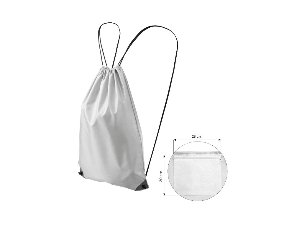 zavírání na stahování 2 polyesterové šňůrky v barvě 01 reflexní prvky v dolních rozích vnitřní kapsa na zip 20 x 23 cm rozměry batohu 45 x 34 cmDoplňkové parametry