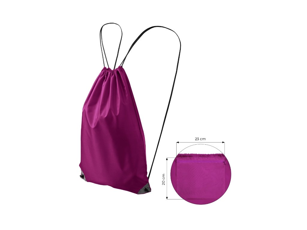 zavírání na stahování 2 polyesterové šňůrky v barvě 01 reflexní prvky v dolních rozích vnitřní kapsa na zip 20 x 23 cm rozměry batohu 45 x 34 cmDoplňkové parametry