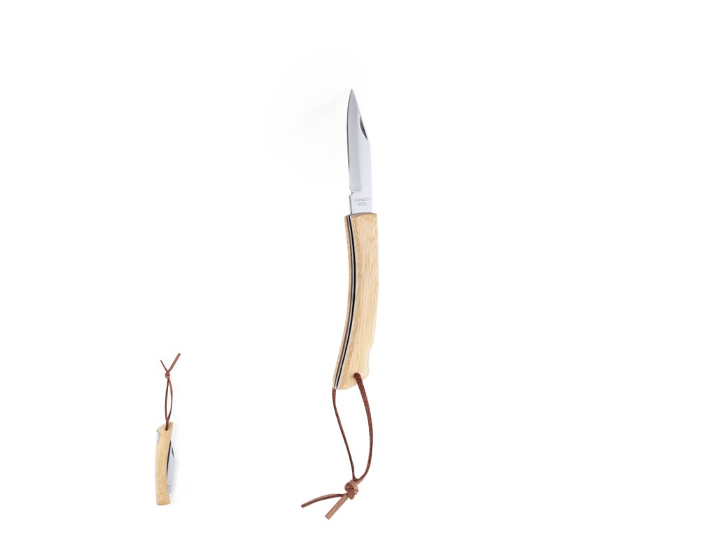 Nůž Nature Line s čepelí z nerezové oceli a odolnou bambusovou rukojetí s bezpečnostní pojistkou. S popruhem z PU kůže a v samostatné krabičce.