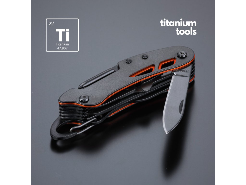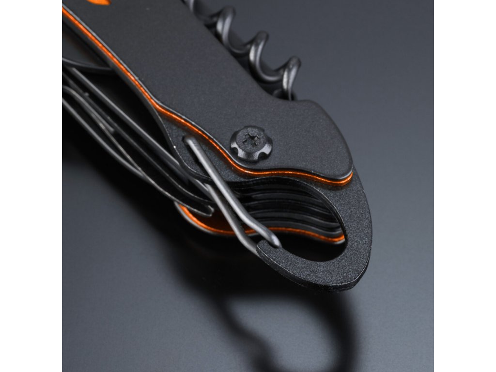 Kapesní nůž Optima v novém kabátě, vyrobené z vysoce kvalitní nerezové oceli s titanovým povlakem pro lepší tvrdost a extra odolnost vůči korozi. Barevné vložky na rukojeti pro jemné zdobení. Hlavní vlastnosti: nůžky, nůž, pilka na dřevo, otvírák na láhve a konzervy, škrabka na ryby, vývrtka, děrovač (např. k propíchnutí plechovky s nápojem), navlékač (pro záplatování duší, zašívání plachetnic, záplatování pneumatiky), pilník na nehty, křížový šroubovák. Kapesní nůž je zakončen karabinou, abyste jej mohli mít stále u sebe.Doplňkové parametry