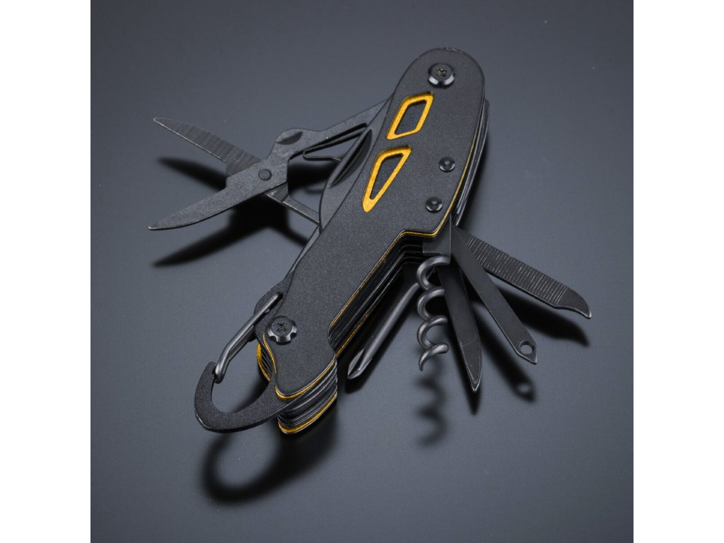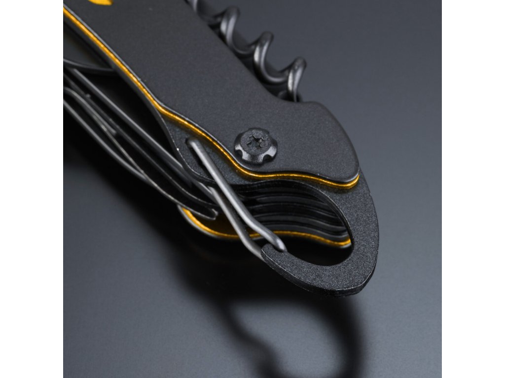 Kapesní nůž Optima v novém kabátě, vyrobené z vysoce kvalitní nerezové oceli s titanovým povlakem pro lepší tvrdost a extra odolnost vůči korozi. Barevné vložky na rukojeti pro jemné zdobení. Hlavní vlastnosti: nůžky, nůž, pilka na dřevo, otvírák na láhve a konzervy, škrabka na ryby, vývrtka, děrovač (např. k propíchnutí plechovky s nápojem), navlékač (pro záplatování duší, zašívání plachetnic, záplatování pneumatiky), pilník na nehty, křížový šroubovák. Kapesní nůž je zakončen karabinou, abyste jej mohli mít stále u sebe.Doplňkové parametry