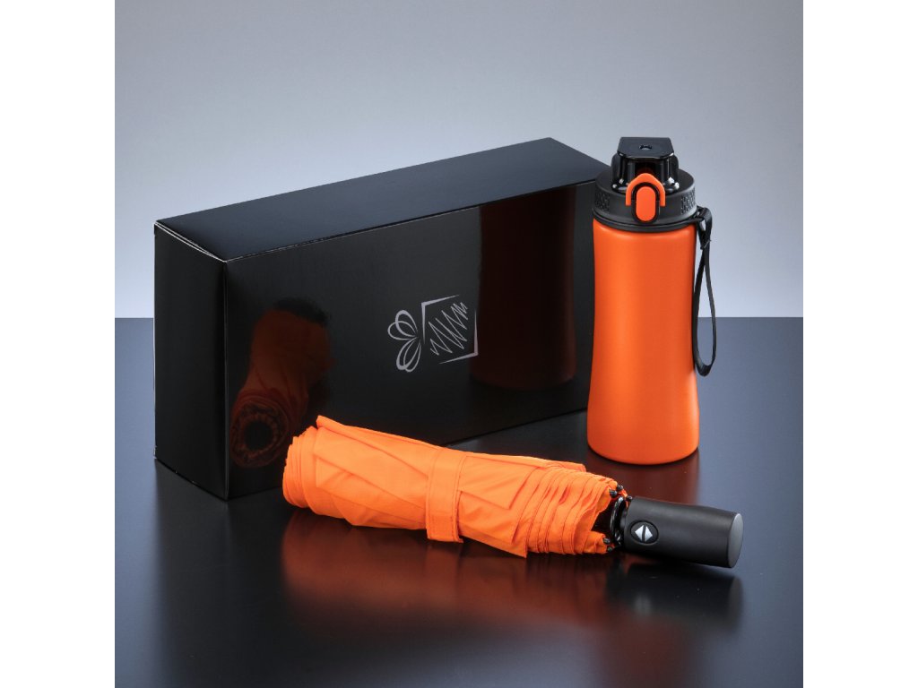 Praktická sada, která dobře poslouží při každodenním používání, obsahující ocelovou láhve na vodu a automatický deštník z kolekce Primo. Láhev na vodu je vyrobena z odolné potravinářské nerezové oceli 18/8 na vnějším i vnitřním plášti, což zajišťuje nejvyšší standardy kvality a trvanlivosti. Produkt poskytuje pohodlné a bezpečné uchopení díky svému ergonomickému tvaru. Inovativní design zahrnuje pohodlný otevírací mechanismus na jedno kliknutí pro rychlý a snadný přístup k vašemu nápoji. Když láhev nepoužíváte, můžete uzávěr uzamknout, aby se obsah nerozlil. Skládací deštník je vysoce kvalitní produkt z kolekce Primo s DAS (Double Automatic System - automatické zavírání a otevírání) a systémem ochrany proti větru. Vlastnosti: pevný kovový rám, žebra potažená skelným vláknem a rukojeť potažená PU, s dodatkem kovového plátu – ideální pro gravírování. Deštník se perfektně hodí do příruční tašky nebo batohu. Produkt má certifikaci REACH. Sada je zabalena v elegantní černé krabičce.Doplňkové parametry