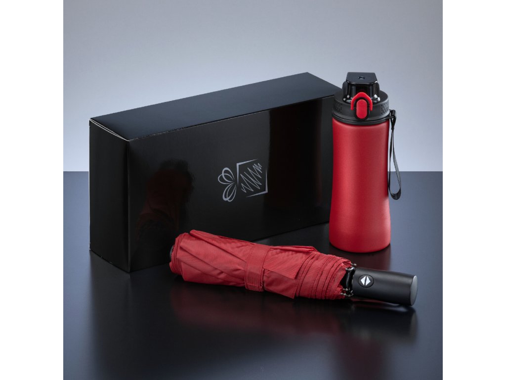 Praktická sada, která dobře poslouží při každodenním používání, obsahující ocelovou láhve na vodu a automatický deštník z kolekce Primo. Láhev na vodu je vyrobena z odolné potravinářské nerezové oceli 18/8 na vnějším i vnitřním plášti, což zajišťuje nejvyšší standardy kvality a trvanlivosti. Produkt poskytuje pohodlné a bezpečné uchopení díky svému ergonomickému tvaru. Inovativní design zahrnuje pohodlný otevírací mechanismus na jedno kliknutí pro rychlý a snadný přístup k vašemu nápoji. Když láhev nepoužíváte, můžete uzávěr uzamknout, aby se obsah nerozlil. Skládací deštník je vysoce kvalitní produkt z kolekce Primo s DAS (Double Automatic System - automatické zavírání a otevírání) a systémem ochrany proti větru. Vlastnosti: pevný kovový rám, žebra potažená skelným vláknem a rukojeť potažená PU, s dodatkem kovového plátu – ideální pro gravírování. Deštník se perfektně hodí do příruční tašky nebo batohu. Produkt má certifikaci REACH. Sada je zabalena v elegantní černé krabičce.Doplňkové parametry