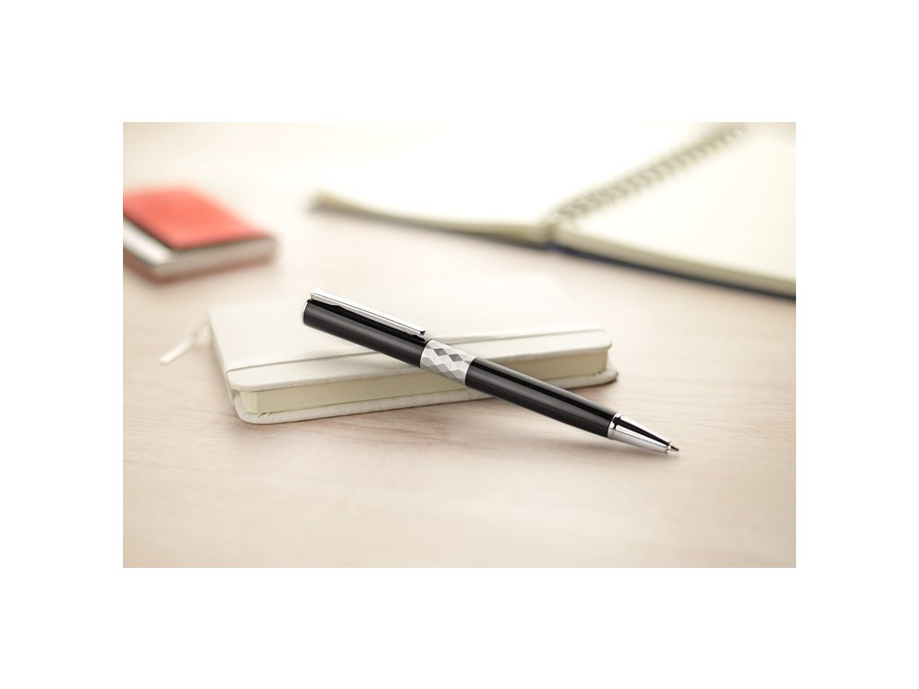 Design moderního pera s nejnovějšími trendy na mysli. Uprostřed těla pera je dekorativní prstenec, jehož tvar připomíná křišťál a dává tomuto peru velmi elegantní vzhled. Označení může být provedeno na těle produktu.Doplňkové parametry