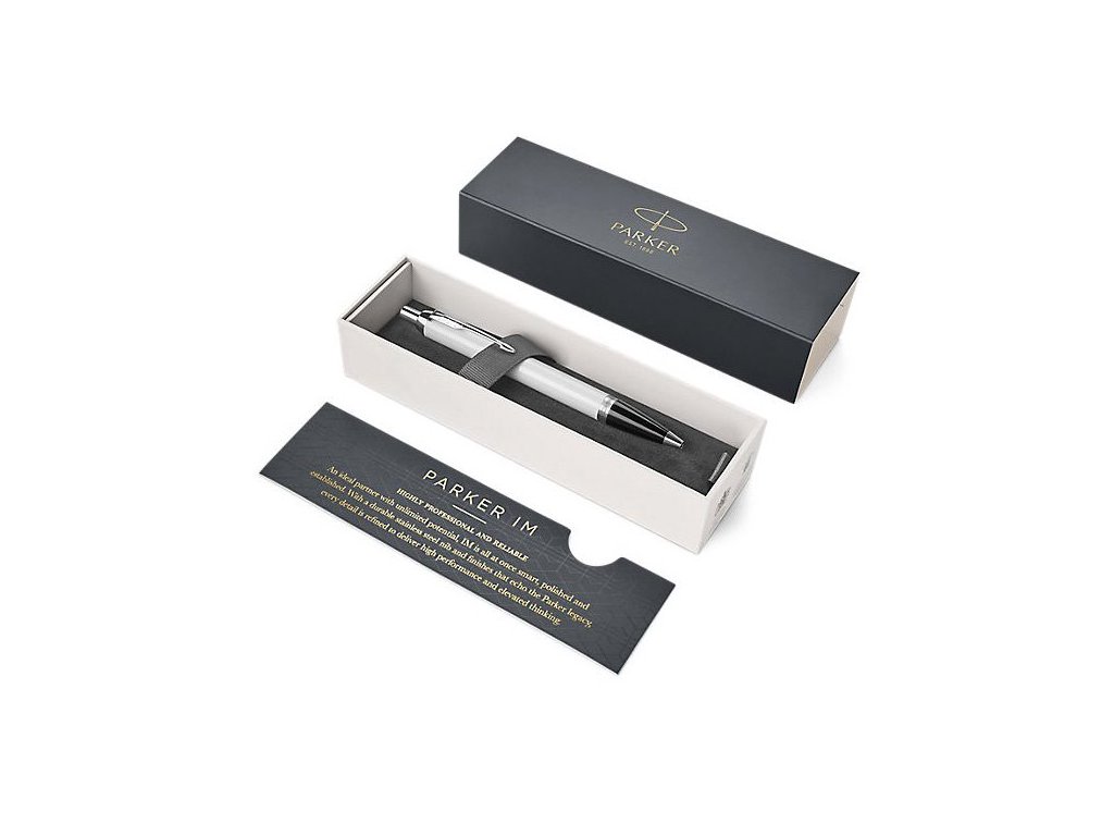 Značkové kuličkové pero PARKER IM White CT má mosazné tělo leskle bíle lakováno. V kombinaci s doplňky pokovenými chromem s leštěnou úpravou. Stiskací mechanismus. Parker IM je ideální partner s neomezenými možnostmi.Doplňkové parametry