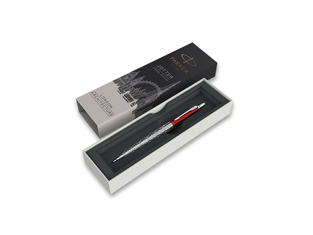 Značkové kuličkové pero PARKER Jotter London Red Classical má tělo i horní část z nerezové oceli, červeně lakovaná horní část je doplněna zdobnými rytinami, vytvořenými pomocí laseru. V kombinaci s doplňky pokovenými chromem s leštěnou úpravou. Stiskací mechanismus. Speciální edice Jotter London Architecture je kolekce inspirovaná architektonickými skvosty britského hlavního města. Vyrobeno ve FranciiDoplňkové parametry
