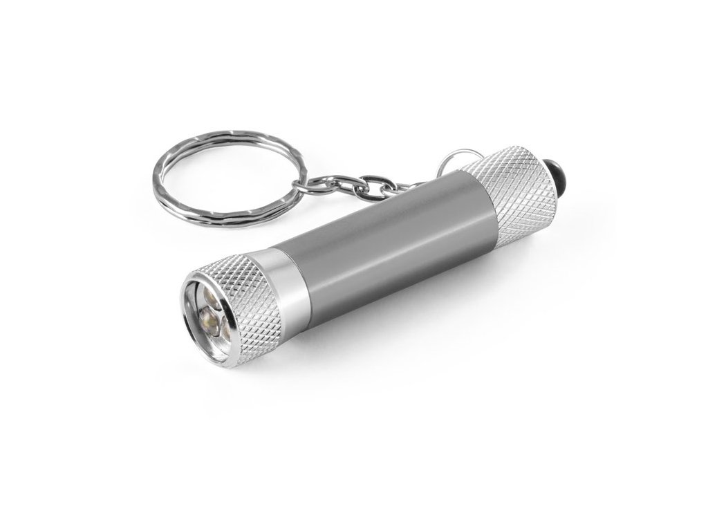 Hliníková klíčenka se třemi LED světly. Zahrnuje čtyři LR44 baterie.