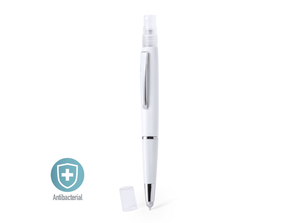 Antibakteriální kuličkové pero s dobíjecím rozprašovačem a ochranným krytem, včetně ukazovátka šedé barvy. Vyrobeno z odolného ABS s lesklým povrchem. Elegantní kovový klip a modrá inkoustová náplň. Objem rozprašovače 3 ml. Tekutina není součástí balení. výrobky s antibakteriální úpravou jsou schopny drasticky snížit množství bakterií přítomných na povrchu materiálů díky přídavku trvalých statických mikrobiálních látek s vysokou účinností při potlačování a prevenci bakteriální kontaminace. položka podle normy ISO 22196, která určuje antibakteriální aktivitu v plastových materiálech a neporézních površích. To nám umožňuje poznat účinnost mikrobiální inhibice, kterou mají aditiva na ošetřených předmětech, pomocí kvantitativního hodnocení.Buďte první, kdo napíše příspěvek k této položce.