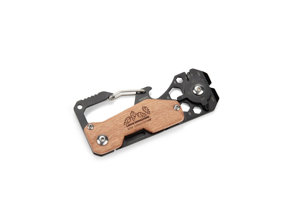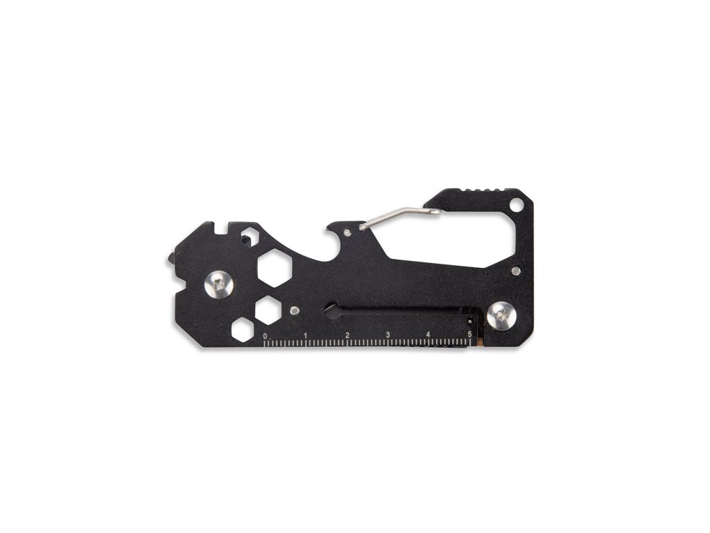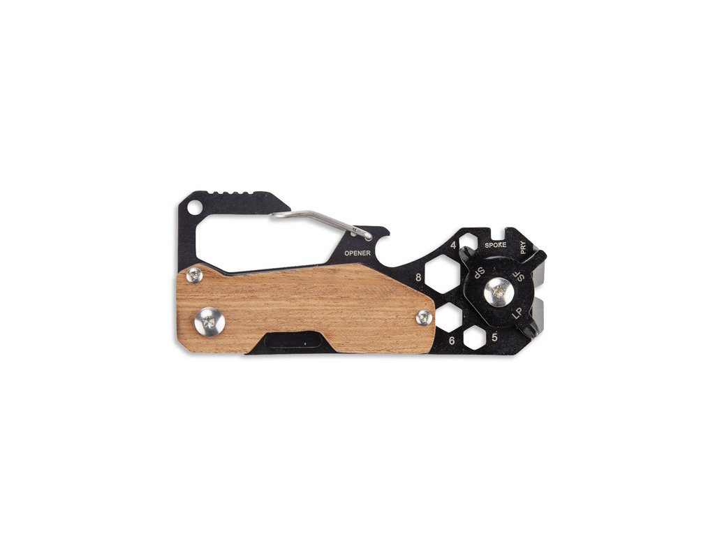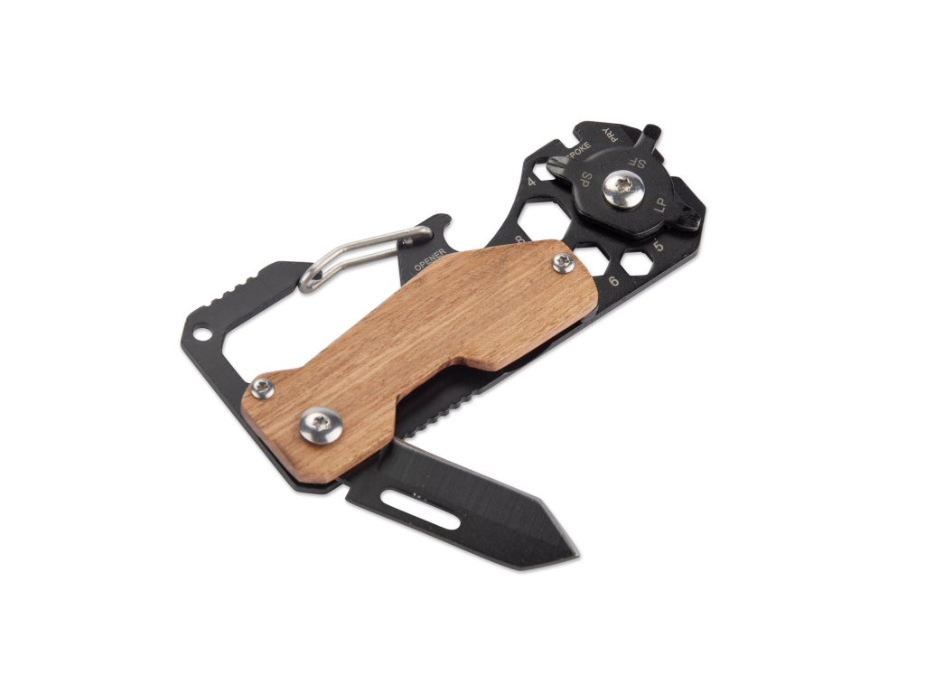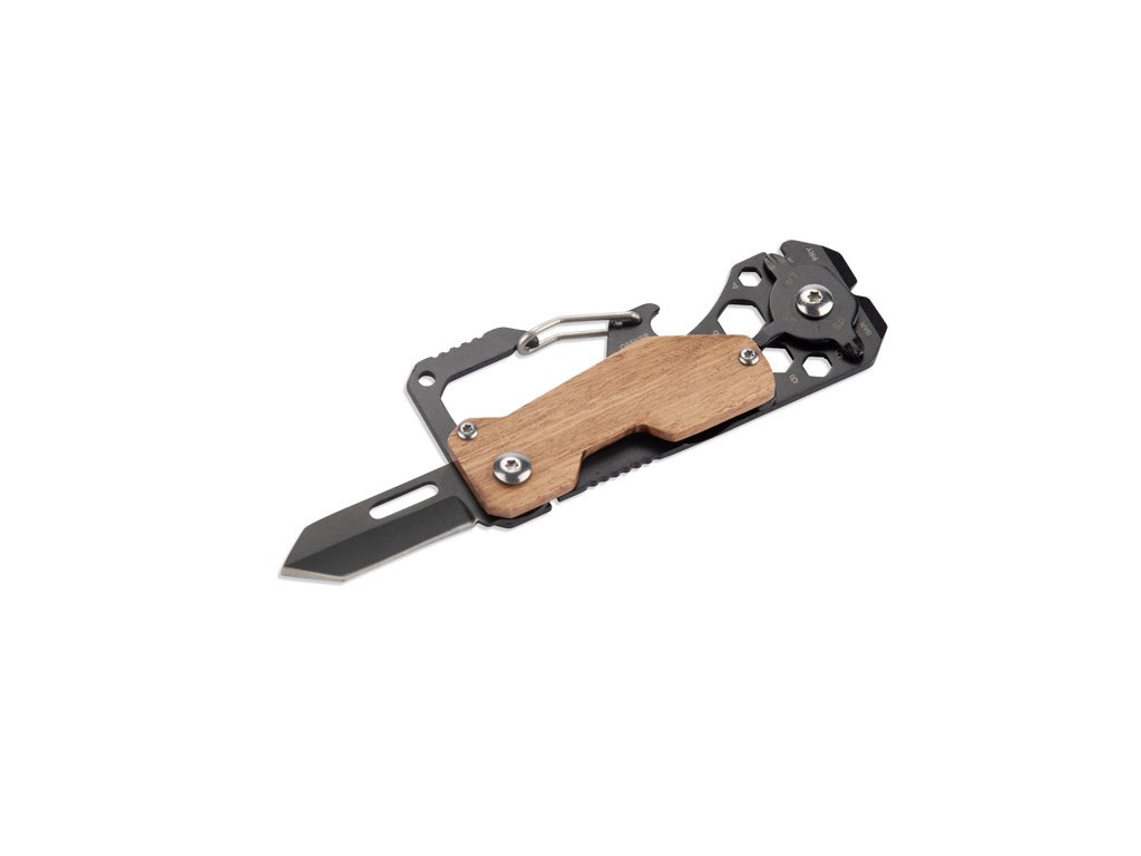 Multifunkční nástroj FINLI s karabinou je praktické řešení pro každou situaci. Vyroben z kovu s dřevěnými prvky, spojuje funkce měřítka/pravítka, karabiny pro připevnění na opasek nebo batoh, otvírák na láhve, nůž, plochý a křížový šroubovák, páčidlo, klíč na dráty a šestihranné klíče. Dále, díky funkci páčení, je ideálním nástrojem pro každodenní použití a údržbové práce.Doplňkové parametry