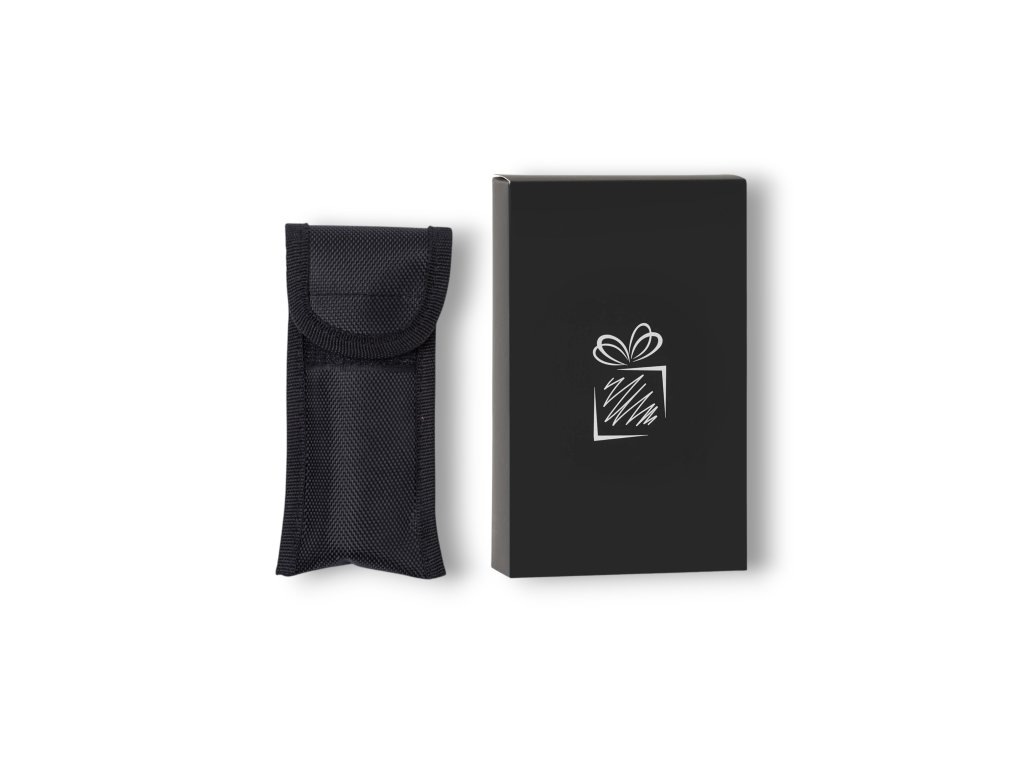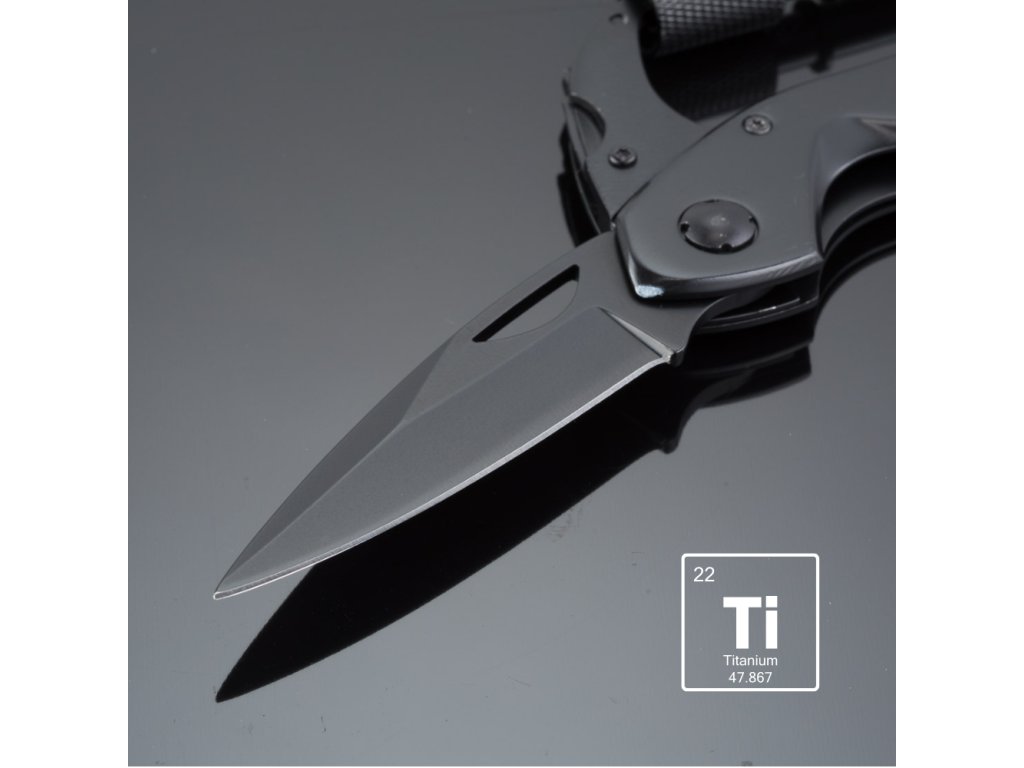 Lehký skládací nůž Optima s karabinou, vyrobený z vysoce kvalitní nerezové oceli s titanovým povlakem pro zvýšenou tvrdost a extra odolnost vůči korozi. Hlavní vlastnosti: ostrý nůž z nerezové oceli, klíč s plochou a vroubkovanou koncovkou, rukojeť třmenového typu, rozbíječ skla, otvírák na láhve. Skládací, lze jej připnout ke kalhotám nebo batohu. Čepel je vyrobena z vysoce kvalitní černé eloxované nerezové oceli. Nůž balený v ochranném polyesterovém pouzdře.Doplňkové parametry