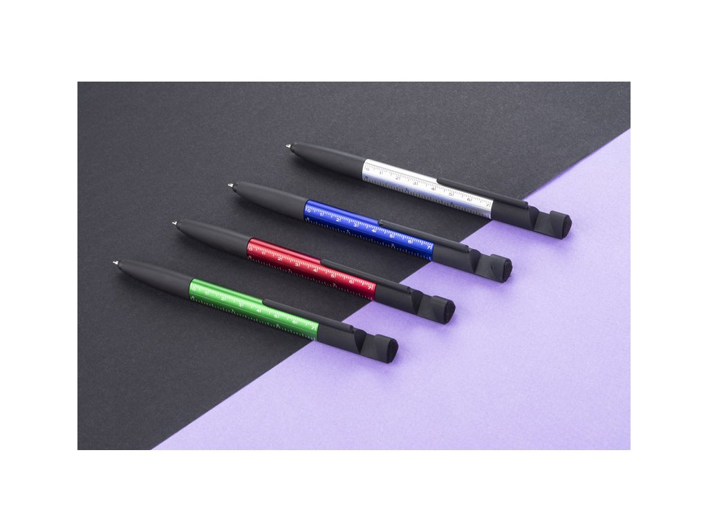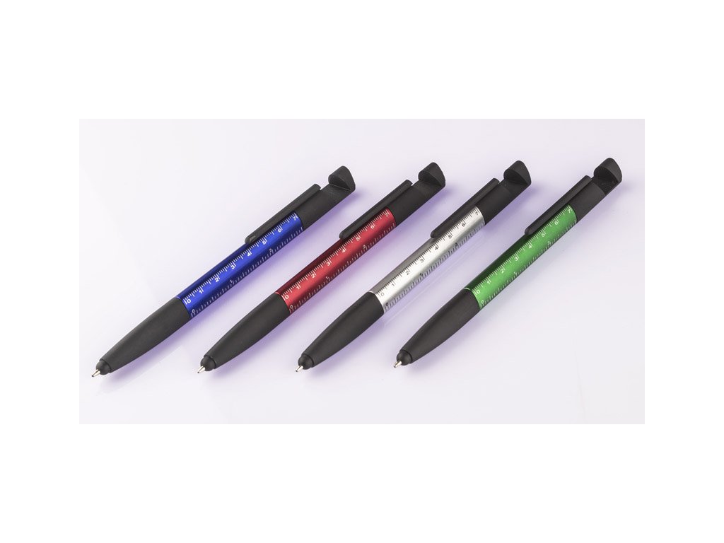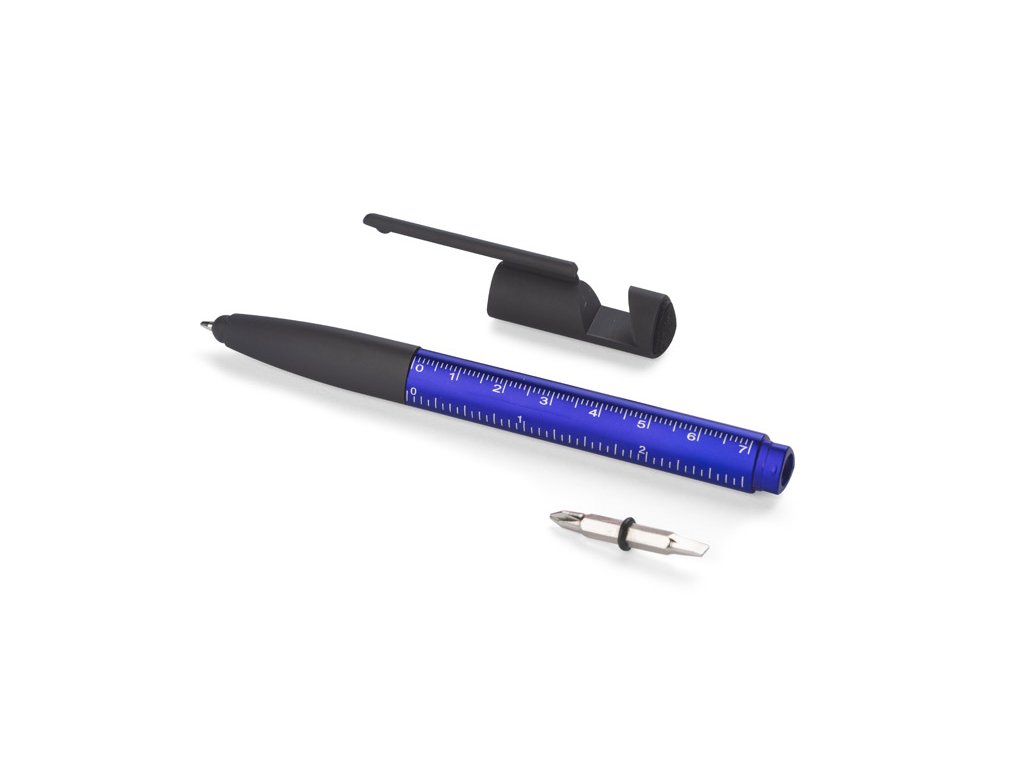 Praktická sada SET, kompaktních rozměrů, který v sobě zahrnuje až 8 funkcí: propiska, hrot na dotekové obrazovky, čisticí utěrka na obrazovky, stojánek na telefon, 2 šroubováky, 2 pravítka (palcové a centimetrové). Vyrobená z umělé hmoty. Spouštěcí mechanismus typu twist. Náplň typu X20 v modré barvě.Doplňkové parametry