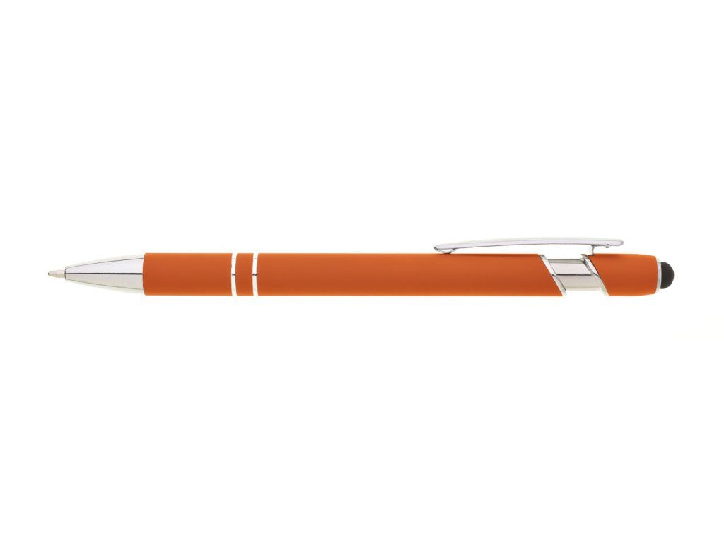 Propiska s touch koncem, měkkým pogumovaným soft povrchem v oranžové barvě a stříbrnými doplňky včetně dvou ozdobných kroužků. (NATIO)Doplňkové parametry