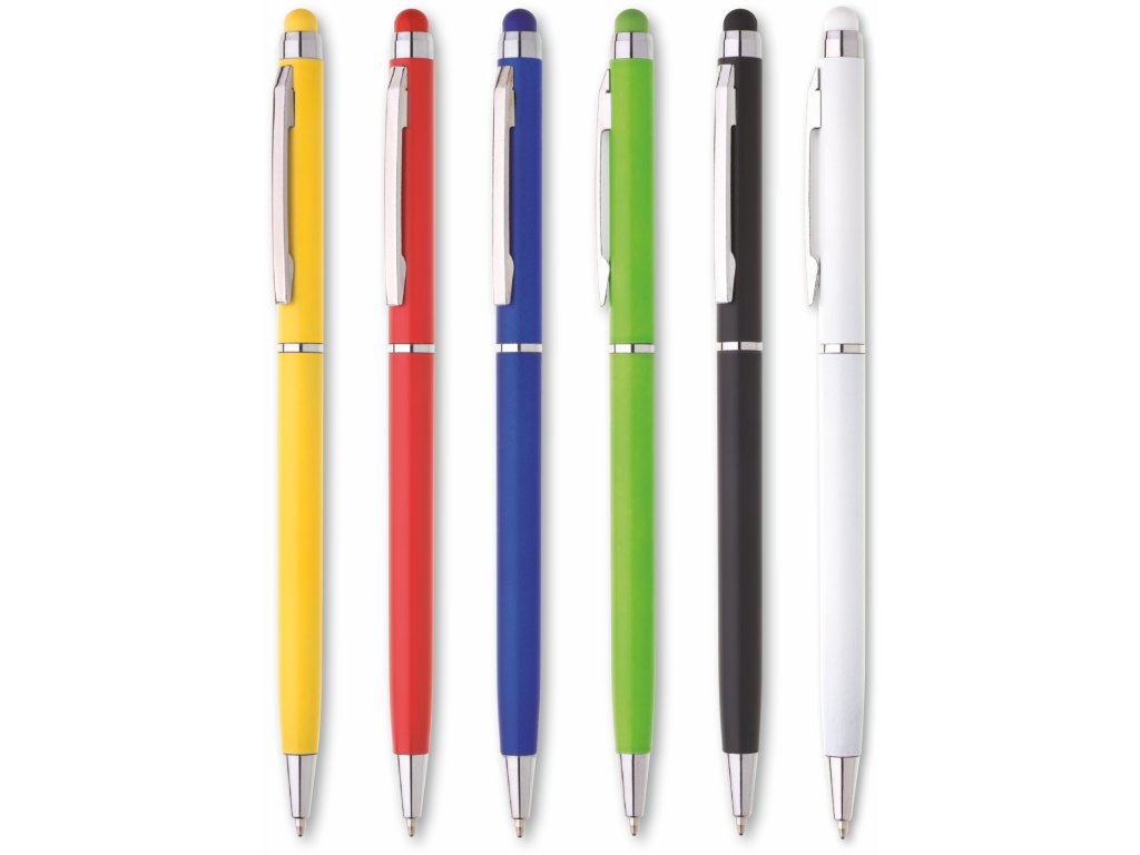 Plastové, kuličkové pero s tenkým, modrým tělem a s chromovými doplňky. Pero má otočný mechanismus a na konci těla touch pro dotykové displeje. Náplň X 20, modře píšící.Doplňkové parametry