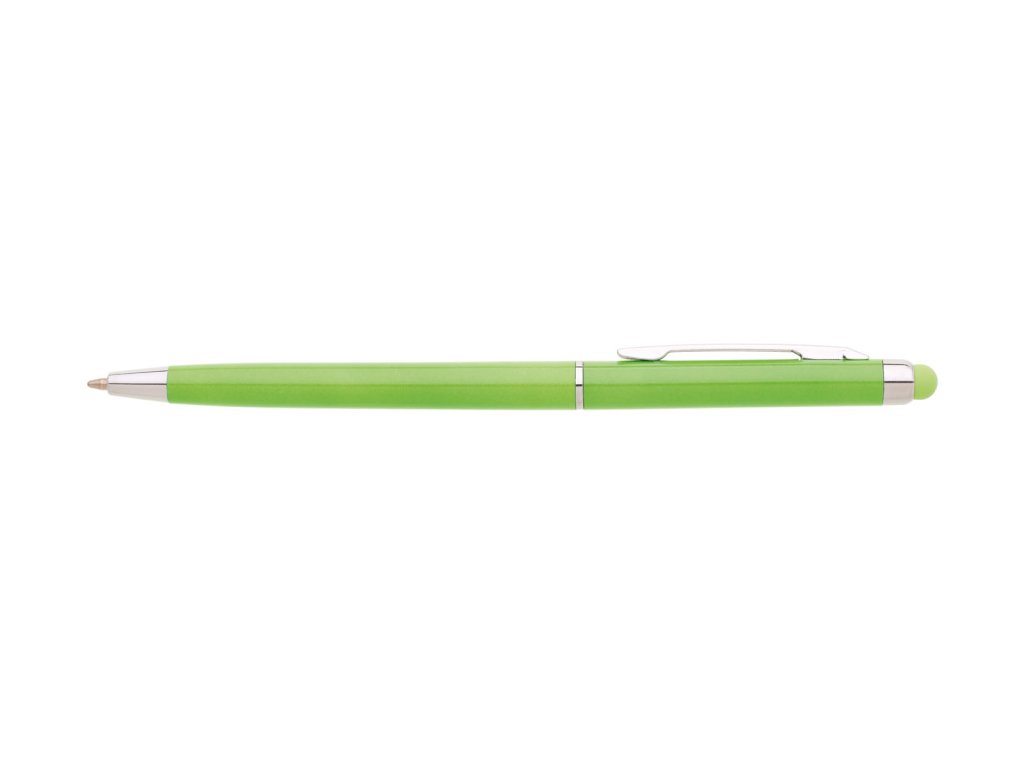 Plastové, kuličkové pero s tenkým, světle zeleným tělem a s chromovými doplňky. Pero má otočný mechanismus a na konci těla touch pro dotykové displeje v barvě těla. Náplň X 20, modře píšící.Doplňkové parametry