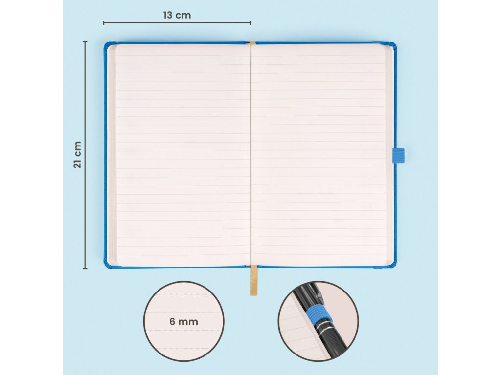 Praktický a lehký linkovaný notes v klasické modré barvě má povrch s hrubší strukturou, na který si můžete nechat vyrazit logo společnosti. Notes má pevnou knižní vazbu a zakulacené rohy, poutko na tužku, elastickou gumičku a textilní záložku. Linky mají 6 mm a jsou na kvalitním žlutém papíře.Doplňkové parametry