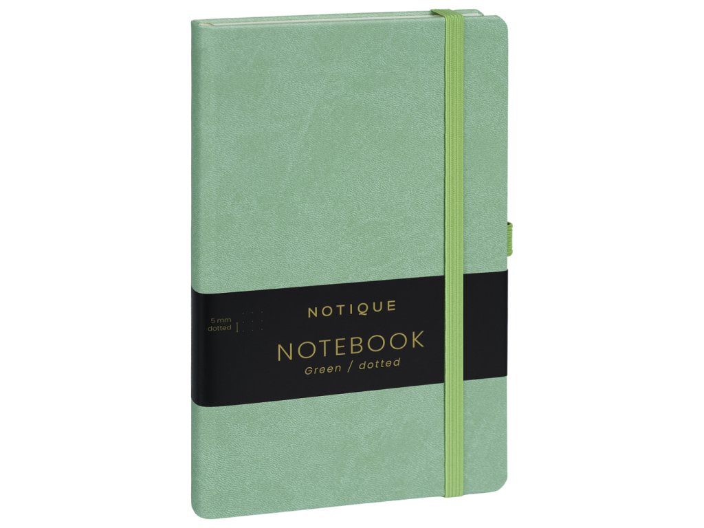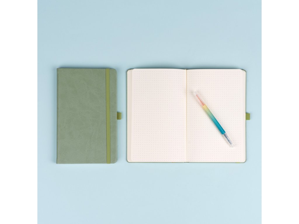 Praktický a lehký tečkovaný notes v trendy zelené barvě má povrch s jemnou strukturou, na který si můžete nechat vyrazit logo společnosti. Notes má pevnou knižní vazbu a zakulacené rohy, poutko na tužku, elastickou gumičku a textilní záložku. Tečky mají 5 mm a jsou na kvalitním žlutém papíře.Doplňkové parametry