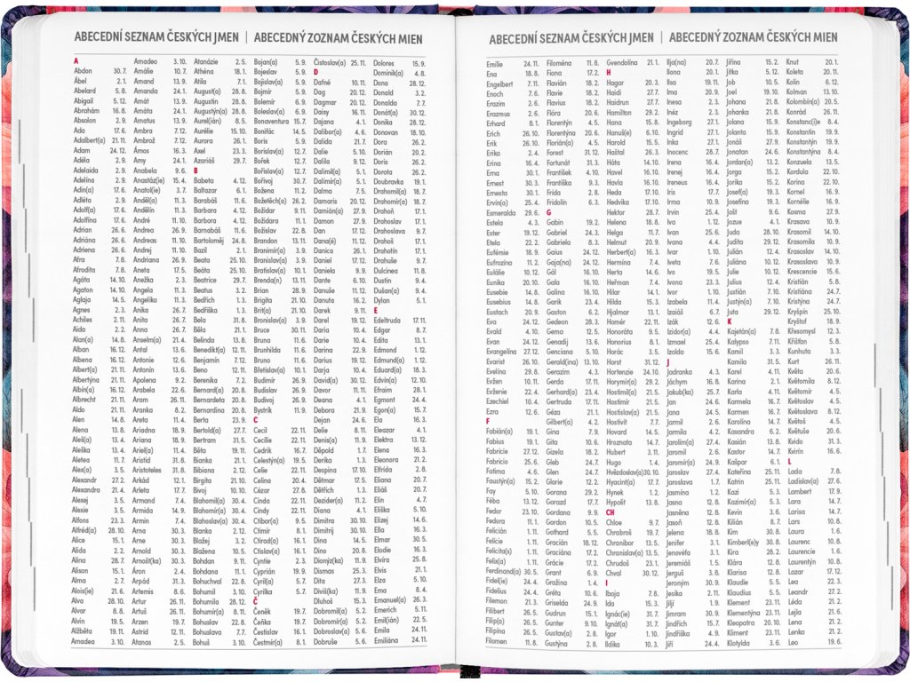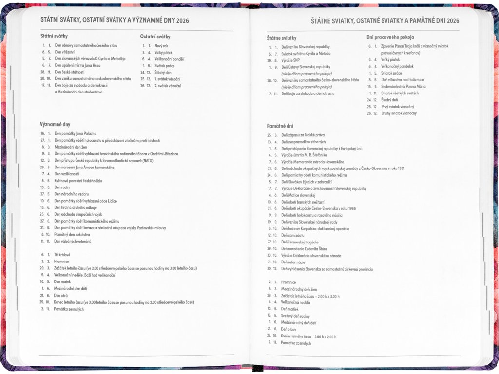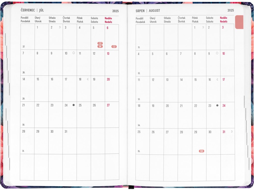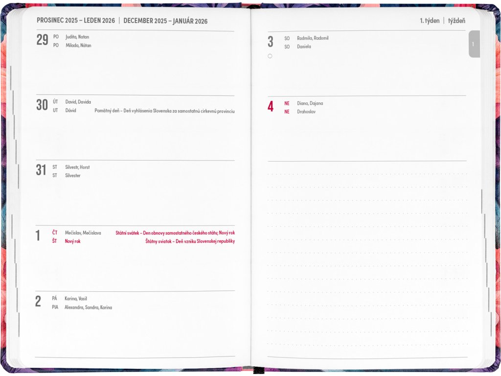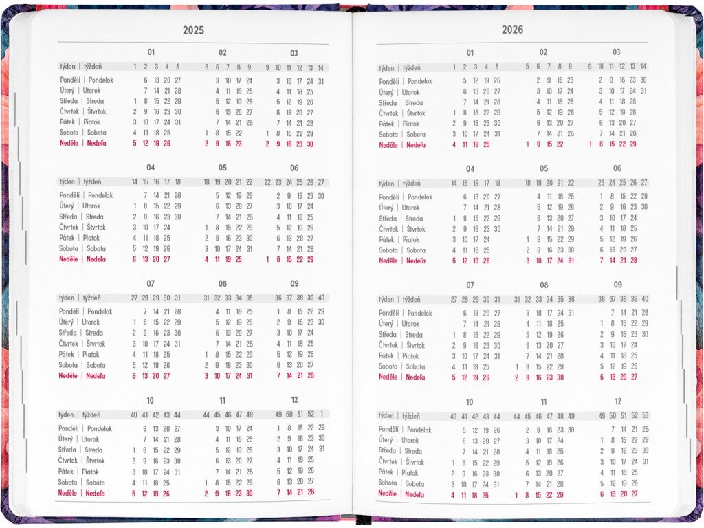 Osmnáctiměsíční diář obsahuje přehled na rok 2025 a 2026, seznam českých a slovenských jmen, česko-slovenské týdenní řádkové kalendárium se jmény a svátky a prostor na poznámky. Kalendárium začíná v červenci 2025 a končí v prosinci 2026.Doplňkové parametry