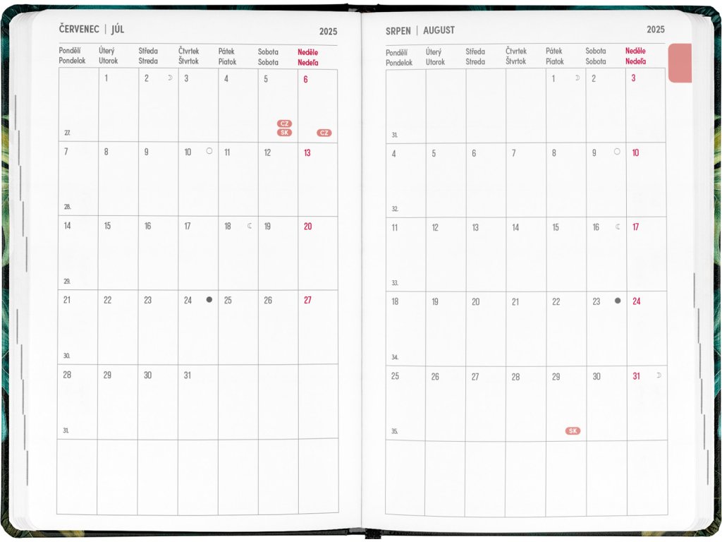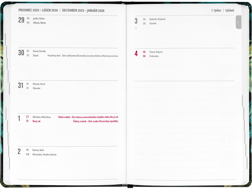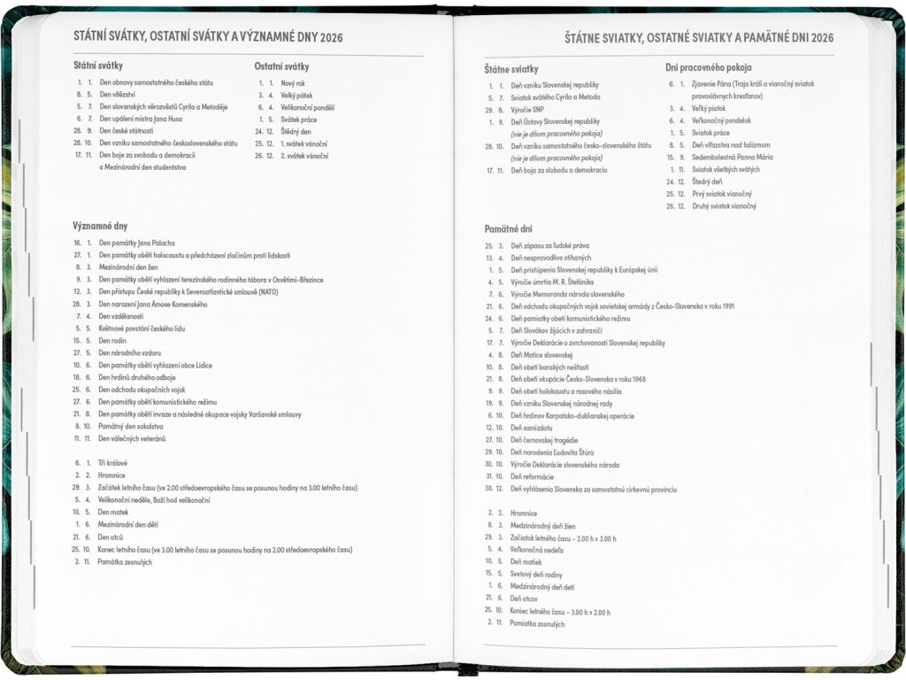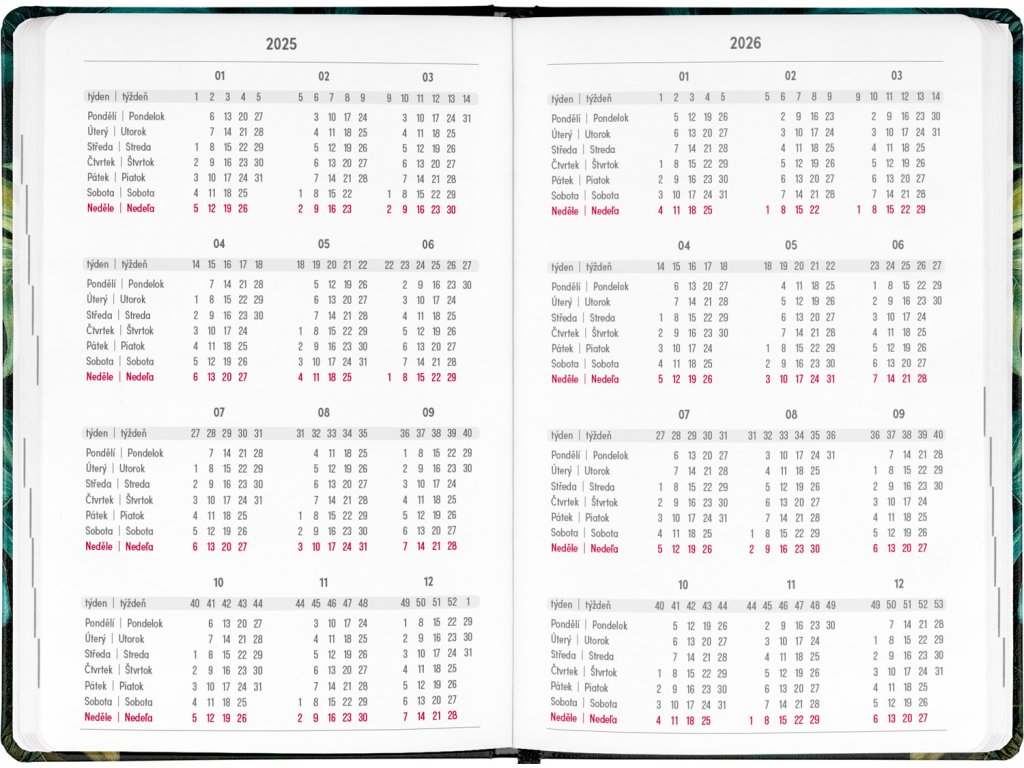 Osmnáctiměsíční diář obsahuje přehled na rok 2025 a 2026, seznam českých a slovenských jmen, česko-slovenské týdenní řádkové kalendárium se jmény a svátky a prostor na poznámky. Kalendárium začíná v červenci 2025 a končí v prosinci 2026.Doplňkové parametry