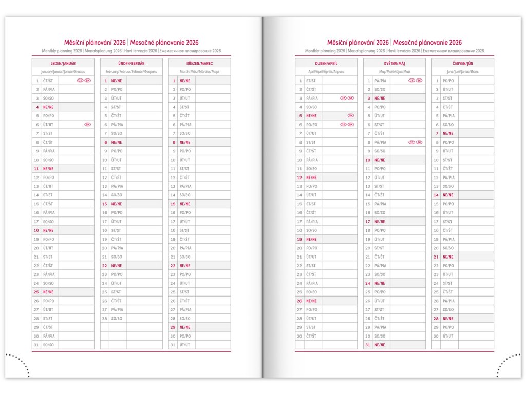 Denní diář Aprint 2026 v červené barvě. Kolekce vsadila na osvědčené barvy, které doplňuje nová ražba letopočtu. Denní rozvrh s česko-slovenským kalendáriem a doplňkovou angličtinou, němčinou, maďarštinou a ruštinou.• kalendárium od prosince 2025