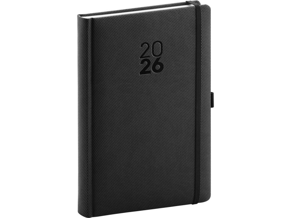 Denní diář Diamante 2026 v černé barvě. Povrch diáře má jemnou strukturu připomínající výbrus diamantu a je ideální pro všechny typy ražeb. Diář má zakulacené rohy, poutko na tužku a elastickou gumičku. Denní rozvrh s česko-slovenským kalendáriem a doplňkovou angličtinou, němčinou, maďarštinou a ruštinou.• kalendárium od prosince 2025