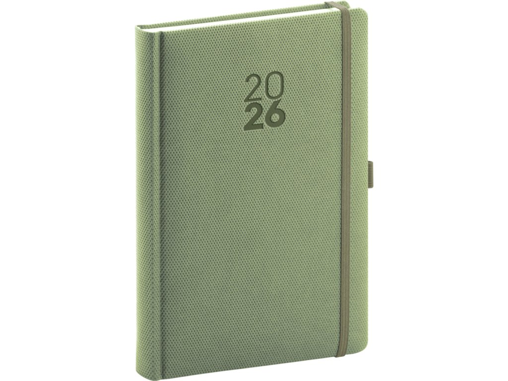 Denní diář Diamante 2026 v olivové barvě. Povrch diáře má jemnou strukturu připomínající výbrus diamantu a je ideální pro všechny typy ražeb. Diář má zakulacené rohy, poutko na tužku a elastickou gumičku. Denní rozvrh s česko-slovenským kalendáriem a doplňkovou angličtinou, němčinou, maďarštinou a ruštinou.• kalendárium od prosince 2025