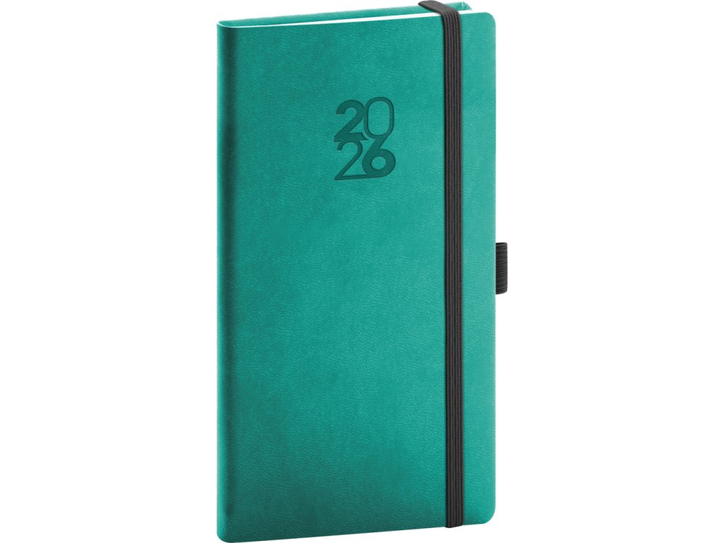 Kapesní diář Aprint Top 2026 v tyrkysové barvě. Rozšíření oblíbené řady Aprint o variantu s gumičkou na zavírání a poutkem na tužku. Týdenní rozvrh s česko-slovenským kalendáriem a doplňkovou angličtinou, němčinou, maďarštinou a ruštinou.• kalendárium od prosince 2025