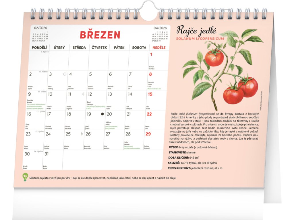 Objevte jedinečný stolní kalendář, který vám každý měsíc nabídne nejen dostatek prostoru na poznámky, ale i semínka rostlin, jež si můžete snadno vypěstovat doma. Stačí zasadit speciální semínkový papír do hlíny, zalévat a sledovat, jak vám rostou rajčata, bazalka, meduňka a další bylinky či zelenina. Ideální pro všechny, kteří chtějí zažít radost z pěstování a mít kousek zahrádky přímo u sebe doma. Obahuje měsíční kalendárium s českými svátky a jmeninami a 12 archů speciálního papíru se semínky.Doplňkové parametry