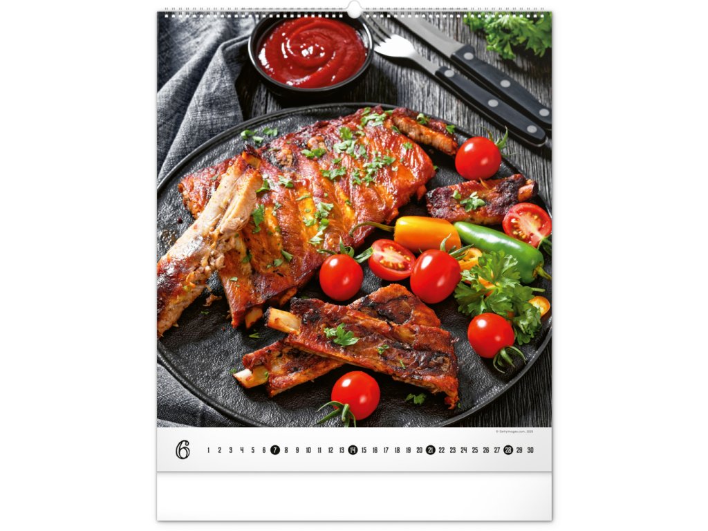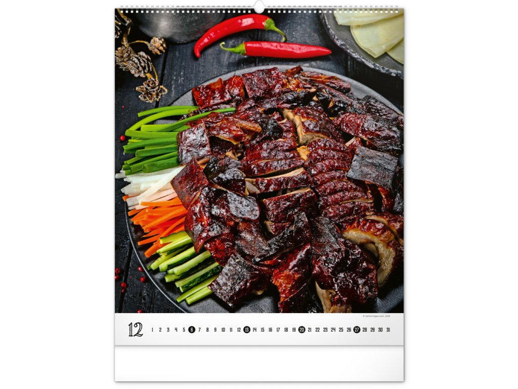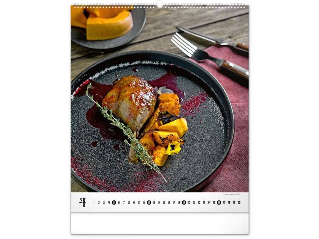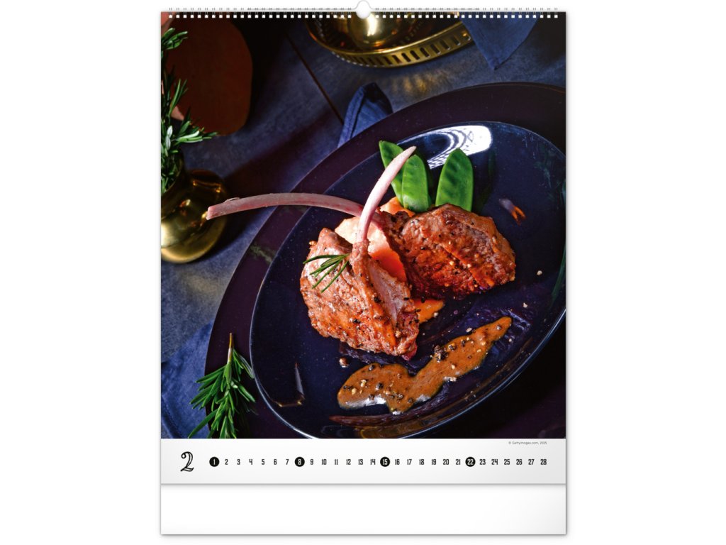 Velkoformátový kalendář z kolekce Platinum Collection obsahuje fotografie luxusních pokrmů, které budete chtít ochutnat. Šťavnaté steaky, křidýlka i stehýnka nebo oku lahodící dezerty oživí interiér v každé kuchyni či jídelně. Kalendář zahrnuje jednoduché kalendárium.Doplňkové parametry